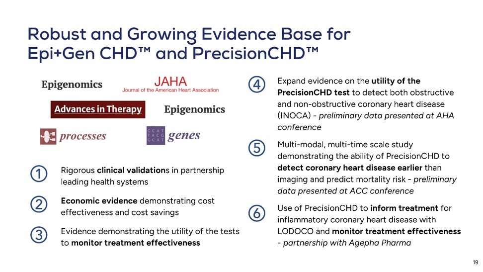 Robust and Growing Evidence Base for Epi+Gen CHD and PrecisionCHD Rigorous clinical validation s in partnership leading health systems Economic evidence demonstrating cost effectiveness and cost savings Evidence demonstrating the utility of the tests to monitor treatment effectiveness Expand evidence on the utility of the PrecisionCHD test to detect both obstructive and non - obstructive coronary heart disease (INOCA) - preliminary data presented at AHA conference Multi - modal, multi - time scale study demonstrating the ability of PrecisionCHD to detect coronary heart disease earlier than imaging and predict mortality risk - preliminary data presented at ACC conference Use of PrecisionCHD to inform treatment for inflammatory coronary heart disease with LODOCO and monitor treatment effectiveness - partnership with Agepha Pharma 19