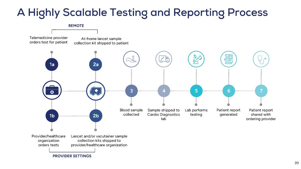 2a 2b 1a 1b REMOTE Telemedicine provider orders test for patient At - home lancet sample collection kit shipped to patient A Highly Scalable Testing and Reporting Process PROVIDER SETTINGS Lancet and/or vacutainer sample collection kits shipped to provider/healthcare organization Provider/healthcare organization orders tests 3 Blood sample collected 4 Sample shipped to Cardio Diagnostics lab 5 Lab performs testing 6 Patient report generated 7 Patient report shared with ordering provider 20