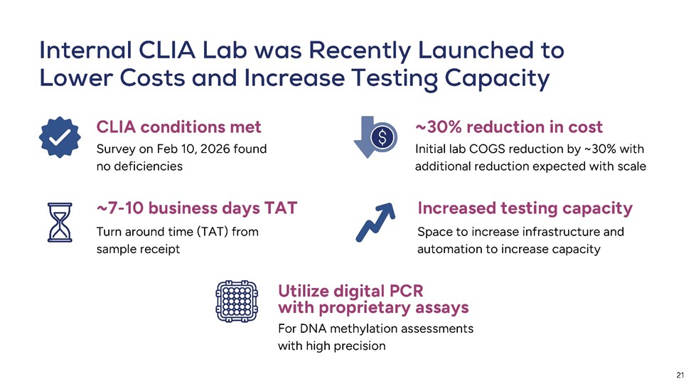 Survey on Feb 10, 2026 found no deficiencies CLIA conditions met For DNA methylation assessments with high precision Utilize digital PCR with proprietary assays Space to increase infrastructure and automation to increase capacity Increased testing capacity Initial lab COGS reduction by ~30% with additional reduction expected with scale ~30% reduction in cost Internal CLIA Lab was Recently Launched to Lower Costs and Increase Testing Capacity Turn around time (TAT) from sample receipt ~7 - 10 business days TAT 21