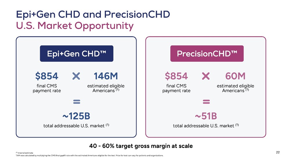 Ep i+Gen CHD and PrecisionCHD U.S. Market Opportunity 40 - 60% target gross margin at scale $854 final CMS payment rate ~125B total addressable U.S. market ⁽ ¹ ⁾ 146M estimated eligible Americans ⁽ ¹ ⁾ $854 final CMS payment rate ~51B total addressable U.S. market ⁽ ¹ ⁾ 60 M estimated eligible Americans ⁽ ¹ ⁾ 22 ⁽ ¹ ⁾ Internal estimate TAM was calculated by multiplying the CMS final gapfill rate with the estimated Americans eligible for the test. Price for te st can vary for patients and organizations.