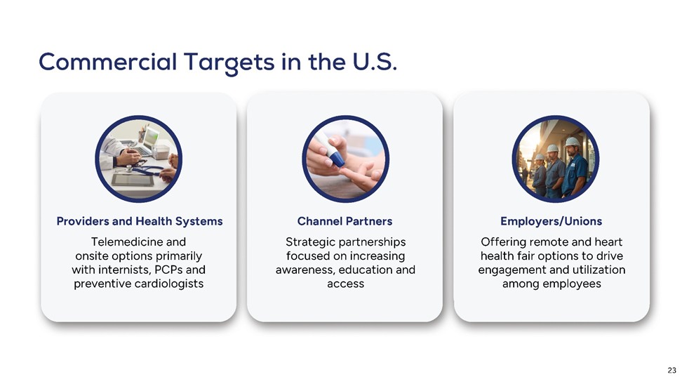 Commercial Targets in the U.S. Employers/Unions Offering remote and heart health fair options to drive engagement and utilization among employees Providers and Health Systems Telemedicine and onsite options primarily with internists, PCPs and preventive cardiologists Channel Partners Strat egic partnerships focused on increasing awareness, education and access 23