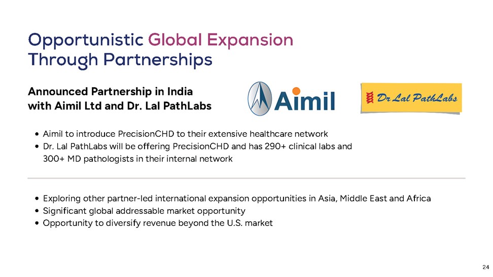 Opportunistic Global Expansion Through Partnerships Announced Partnership in India with Aimil Ltd and Dr. Lal PathLabs • Aimil to introduce PrecisionCHD to their extensive healthcare network • Dr. Lal PathLabs will be offering PrecisionCHD and has 290+ clinical labs and 300+ MD pathologists in their internal network • Exploring other partner - led international expansion opportunities in Asia, Middle East and Africa • Significant global addressable market opportunity • Opportunity to diversify revenue beyond the U.S. market 24