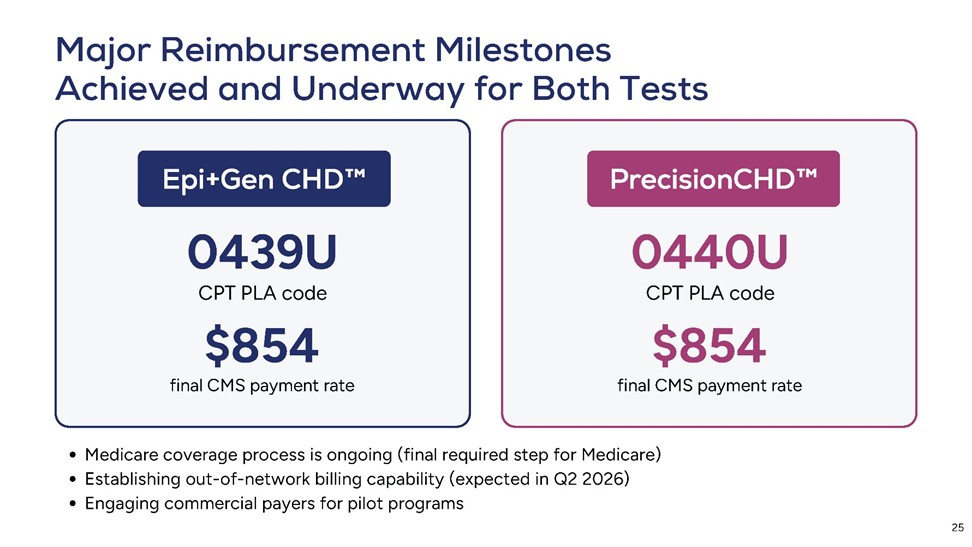 Major Reimbursement Milestones Achieved and Underway for Both Tests 0439U CPT PLA code $854 final CMS payment rate 0440U CPT PLA code $854 final CMS payment rate • Medicare cover age process is ongoing (final required step for Medicare) • Establishing out - of - network billing capability (expected in Q2 2026) • Engaging commercial payers for pilot programs 25
