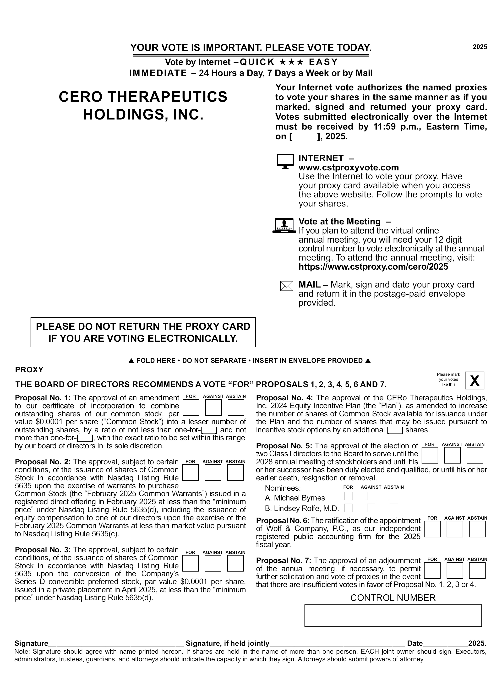 YOUR VOTE IS IMPORTANT. PLEASE VOTE TODAY. Vote by Internet - QUICK EASYIMMEDIATE - 24 Hours a Day, 7 Days a Week or by Mail 2025 CERO THERAPEUTICSHOLDINGS, INC. Your Internet vote authorizes the named proxies to vote your shares in the same manner as if you marked, signed and returned your proxy card. Votes submitted electronically over the Internet must be received by 11:59 p.m., Eastern Time, on [ ], 2025. INTERNET – www.cstproxyvote.comUse the Internet to vote your proxy. Have your proxy card available when you access the above website. Follow the prompts to vote your shares. Vote at the Meeting – If you plan to attend the virtual online annual meeting, you will need your 12 digit control number to vote electronically at the annual meeting. To attend the annual meeting, visit: https://www.cstproxy.com/cero/2025MAIL – Mark, sign and date your proxy card and return it in the postage-paid envelope provided. PLEASE DO NOT RETURN THE PROXY CARD IF YOU ARE VOTING ELECTRONICALLY. FOLD HERE • DO NOT SEPARATE • INSERT IN ENVELOPE PROVIDED PROXY Please mark your votes like this THE BOARD OF DIRECTORS RECOMMENDS A VOTE “FOR” PROPOSALS 1, 2, 3, 4, 5, 6 AND 7. FORAGAINSTABSTAIN Proposal No. 1: The approval of an amendment to our certificate of incorporation to combine outstanding shares of our common stock, par value $0.0001 per share (“Common Stock”) into a lesser number of outstanding shares, by a ratio of not less than one-for-[___] and not more than one-for-[___], with the exact ratio to be set within this range by our board of directors in its sole discretion. Proposal No. 2: The approval, subject to certain conditions, of the issuance of shares of Common Stock in accordance with Nasdaq Listing Rule 5635 upon the exercise of warrants to purchase Common Stock (the “February 2025 Common Warrants”) issued in a registered direct offering in February 2025 at less than the “minimum price” under Nasdaq Listing Rule 5635(d), including the issuance of equity compensation to one of our directors upon the exercise of the February 2025 Common Warrants at less than market value pursuant to Nasdaq Listing Rule 5635(c).Proposal No. 3: The approval, subject to certain conditions, of the issuance of shares of Common Stock in accordance with Nasdaq Listing Rule 5635 upon the conversion of the Company’s Series D convertible preferred stock, par value $0.0001 per share, issued in a private placement in April 2025, at less than the “minimum price” under Nasdaq Listing Rule 5635(d). Proposal No. 4: The approval of the CER o Therapeutics Holdings, Inc. 2024 Equity Incentive Plan (the “Plan”), as amended to increase the number of shares of Common Stock available for issuance under the Plan and the number of shares that may be issued pursuant to incentive stock options by an additional [___] shares. Proposal No. 5: The approval of the election of two Class I directors to the Board to serve until the 2028 annual meeting of stockholders and until his or her successor has been duly elected and qualified, or until his or her earlier death, resignation or removal. Nominees: A. Michael Byrnes B. Lindsey Rolfe, M.D.Proposal No. 6: The ratification of the appointment of Wolf & Company, P.C., as our independent registered public accounting firm for the 2025 fiscal year. Proposal No. 7: The approval of an adjournment of the annual meeting, if necessary, to permit further solicitation and vote of proxies in the event that there are insufficient votes in favor of Proposal No. 1, 2, 3 or 4.CONTROL NUMBER Signature Signature, if held jointly Date 2025. Note: Signature should agree with name printed hereon. If shares are held in the name of more than one person, EACH joint owner should sign. Executors, administrators, trustees, guardians, and attorneys should indicate the capacity in which they sign. Attorneys should submit powers of attorney.