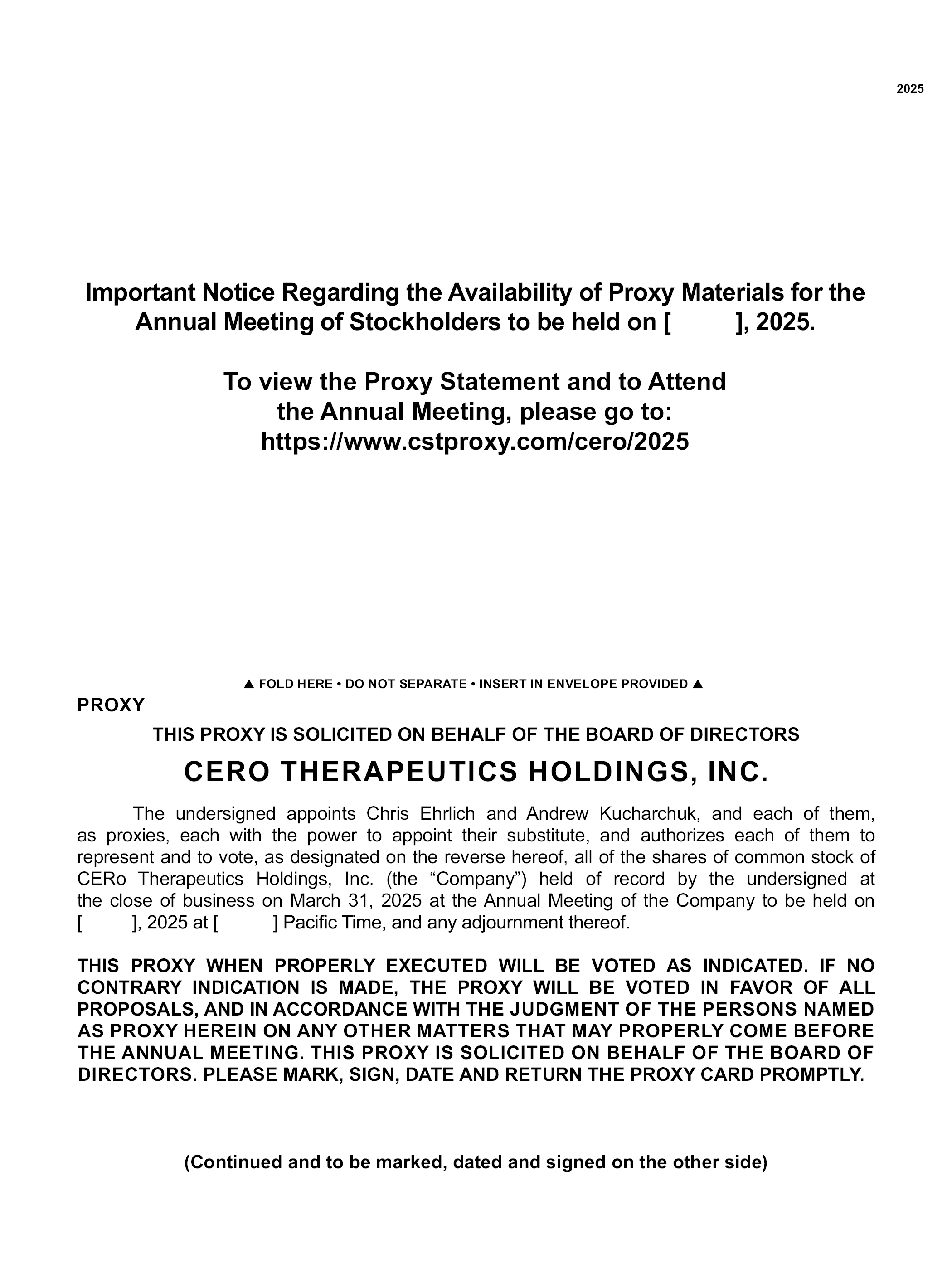 2025 Important Notice Regarding the Availability of Proxy Materials for the Annual Meeting of Stockholders to be held on [ ], 2025.To view the Proxy Statement and to Attend the Annual Meeting, please go to: https://www.cstproxy.com/cero/2025 PROXY FOLD HERE DO NOT SEPARATE INSERT IN ENVELOPE PROVIDED THIS PROXY IS SOLICITED ON BEHALF OF THE BOARD OF DIRECTORSCERO THERAPEUTICS HOLDINGS, INC. The undersigned appoints Chris Ehrlich and Andrew Kucharchuk, and each of them, as proxies, each with the power to appoint their substitute, and authorizes each of them to represent and to vote, as designated on the reverse hereof, all of the shares of common stock of CER o Therapeutics Holdings, Inc. (the “Company”) held of record by the undersigned at the close of business on March 31, 2025 at the Annual Meeting of the Company to be held on [ ], 2025 at [ ] Pacific Time, and any adjournment thereof. THIS PROXY WHEN PROPERLY EXECUTED WILL BE VOTED AS INDICATED. IF NO CONTRARY INDICATION IS MADE, THE PROXY WILL BE VOTED IN FAVOR OF ALL PROPOSALS, AND IN ACCORDANCE WITH THE JUDGMENT OF THE PERSONS NAMED AS PROXY HEREIN ON ANY OTHER MATTERS THAT MAY PROPERLY COME BEFORE THE ANNUAL MEETING. THIS PROXY IS SOLICITED ON BEHALF OF THE BOARD OF DIRECTORS. PLEASE MARK, SIGN, DATE AND RETURN THE PROXY CARD PROMPTLY.(Continued and to be marked, dated and signed on the other side)
