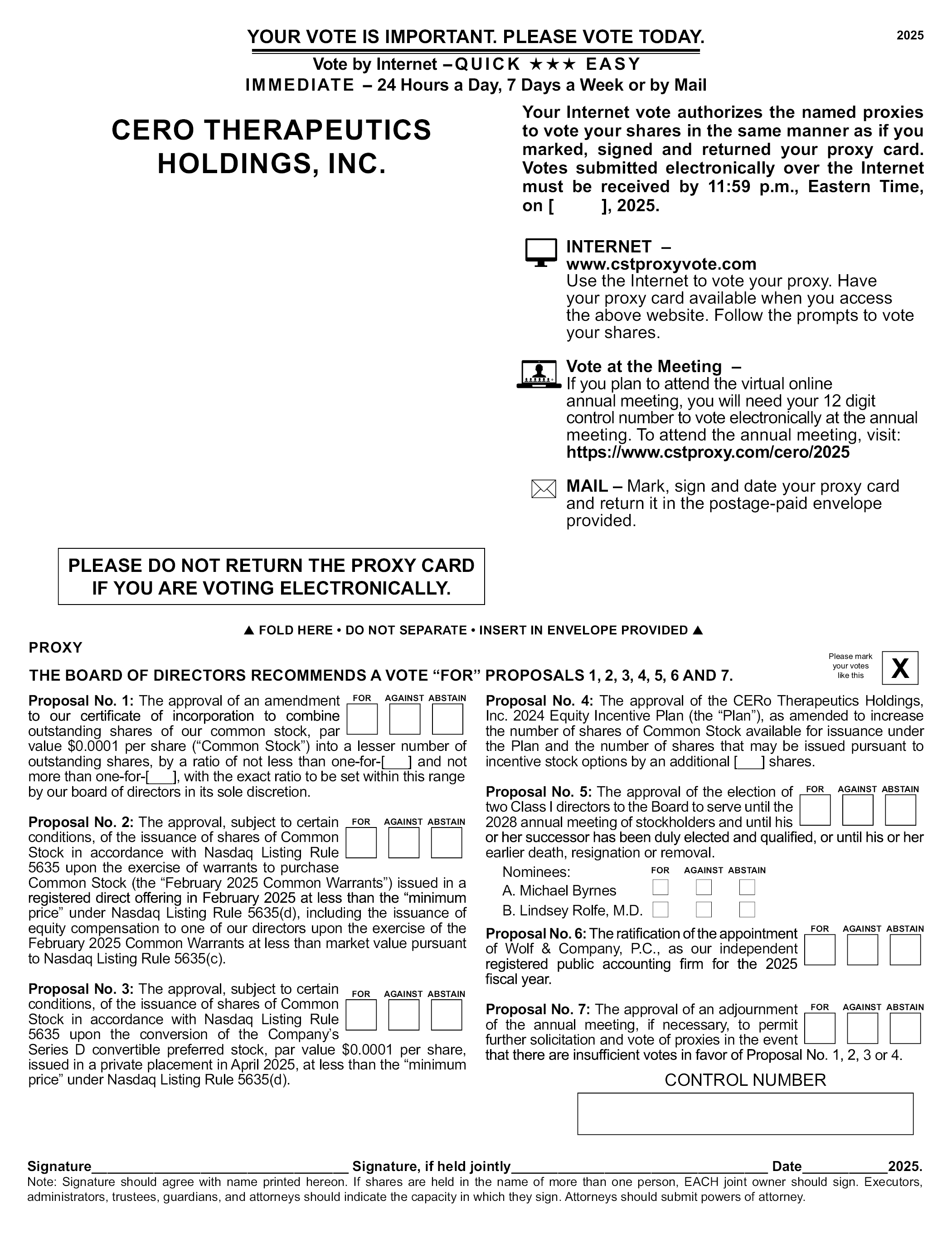 YOUR VOTE IS IMPORTANT. PLEASE VOTE TODAY. Vote by Internet - QUICK EASYIMMEDIATE - 24 Hours a Day, 7 Days a Week or by Mail 2025 CERO THERAPEUTICSHOLDINGS, INC. Your Internet vote authorizes the named proxies to vote your shares in the same manner as if you marked, signed and returned your proxy card. Votes submitted electronically over the Internet must be received by 11:59 p.m., Eastern Time, on [ ], 2025. INTERNET – www.cstproxyvote.comUse the Internet to vote your proxy. Have your proxy card available when you access the above website. Follow the prompts to vote your shares. Vote at the Meeting – If you plan to attend the virtual online annual meeting, you will need your 12 digit control number to vote electronically at the annual meeting. To attend the annual meeting, visit: https://www.cstproxy.com/cero/2025MAIL – Mark, sign and date your proxy card and return it in the postage-paid envelope provided. PLEASE DO NOT RETURN THE PROXY CARD IF YOU ARE VOTING ELECTRONICALLY. FOLD HERE • DO NOT SEPARATE • INSERT IN ENVELOPE PROVIDED PROXY Please mark your votes like this THE BOARD OF DIRECTORS RECOMMENDS A VOTE “FOR” PROPOSALS 1, 2, 3, 4, 5, 6 AND 7. FORAGAINSTABSTAIN Proposal No. 1: The approval of an amendment to our certificate of incorporation to combine outstanding shares of our common stock, par value $0.0001 per share (“Common Stock”) into a lesser number of outstanding shares, by a ratio of not less than one-for-[___] and not more than one-for-[___], with the exact ratio to be set within this range by our board of directors in its sole discretion. Proposal No. 2: The approval, subject to certain conditions, of the issuance of shares of Common Stock in accordance with Nasdaq Listing Rule 5635 upon the exercise of warrants to purchase Common Stock (the “February 2025 Common Warrants”) issued in a registered direct offering in February 2025 at less than the “minimum price” under Nasdaq Listing Rule 5635(d), including the issuance of equity compensation to one of our directors upon the exercise of the February 2025 Common Warrants at less than market value pursuant to Nasdaq Listing Rule 5635(c).Proposal No. 3: The approval, subject to certain conditions, of the issuance of shares of Common Stock in accordance with Nasdaq Listing Rule 5635 upon the conversion of the Company’s Series D convertible preferred stock, par value $0.0001 per share, issued in a private placement in April 2025, at less than the “minimum price” under Nasdaq Listing Rule 5635(d). Proposal No. 4: The approval of the CER o Therapeutics Holdings, Inc. 2024 Equity Incentive Plan (the “Plan”), as amended to increase the number of shares of Common Stock available for issuance under the Plan and the number of shares that may be issued pursuant to incentive stock options by an additional [___] shares. Proposal No. 5: The approval of the election of two Class I directors to the Board to serve until the 2028 annual meeting of stockholders and until his or her successor has been duly elected and qualified, or until his or her earlier death, resignation or removal. Nominees: A. Michael Byrnes B. Lindsey Rolfe, M.D.Proposal No. 6: The ratification of the appointment of Wolf & Company, P.C., as our independent registered public accounting firm for the 2025 fiscal year. Proposal No. 7: The approval of an adjournment of the annual meeting, if necessary, to permit further solicitation and vote of proxies in the event that there are insufficient votes in favor of Proposal No. 1, 2, 3 or 4.CONTROL NUMBER Signature Signature, if held jointly Date 2025. Note: Signature should agree with name printed hereon. If shares are held in the name of more than one person, EACH joint owner should sign. Executors, administrators, trustees, guardians, and attorneys should indicate the capacity in which they sign. Attorneys should submit powers of attorney.