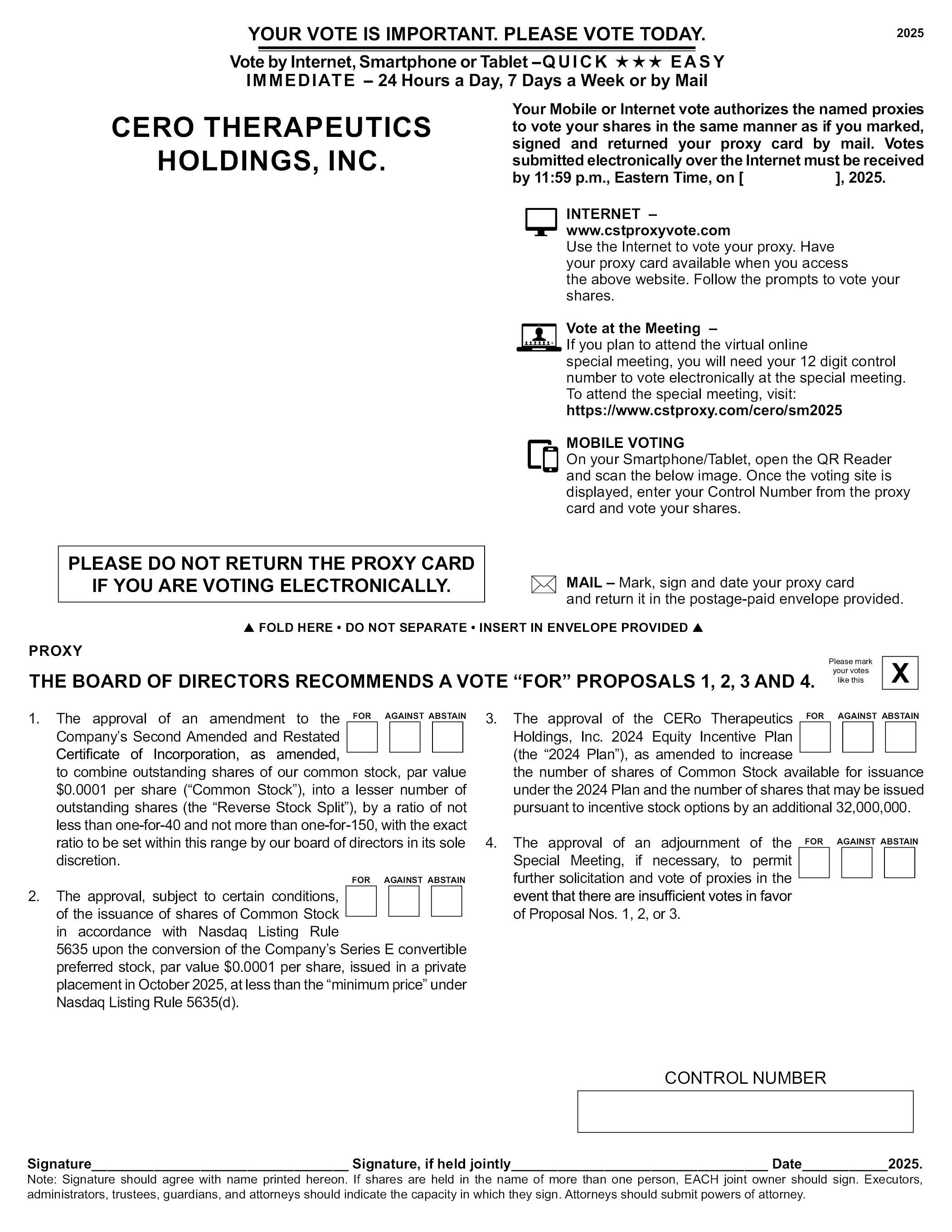 YOUR VOTE IS IMPORTANT. PLEASE VOTE TODAY. Vote by Internet, Smartphone or Tablet - QUICK EASY IMMEDIATE - 24 Hours a Day, 7 Days a Week or by Mail 2025 CERO THERAPEUTICS HOLDINGS, INC. Your Mobile or Internet vote authorizes the named proxies to vote your shares in the same manner as if you marked, signed and returned your proxy card by mail. Votes submitted electronically over the Internet must be received by 11:59 p.m., Eastern Time, on [], 2025. INTERNET – www.cstproxyvote.com Use the Internet to vote your proxy. Have your proxy card available when you access the above website. Follow the prompts to vote your shares. Vote at the Meeting – If you plan to attend the virtual online special meeting, you will need your 12 digit control number to vote electronically at the special meeting. To attend the special meeting, visit: https://www.cstproxy.com/cero/sm2025 MOBILE VOTING On your Smartphone/Tablet, open the QR Reader and scan the below image. Once the voting site is displayed, enter your Control Number from the proxy card and vote your shares. MAIL – Mark, sign and date your proxy card and return it in the postage-paid envelope provided. PLEASE DO NOT RETURN THE PROXY CARD IF YOU ARE VOTING ELECTRONICALLY. FOLD HERE DO NOT SEPARATE INSERT IN ENVELOPE PROVIDED PROXY THE BOARD OF DIRECTORS RECOMMENDS A VOTE “FOR” PROPOSALS 1, 2, 3 AND 4. Please mark your votes like this 1. The approval of an amendment to the Company’s Second Amended and Restated Certificate of Incorporation, as amended, to combine outstanding shares of our common stock, par value $0.0001 per share (“Common Stock”), into a lesser number of outstanding shares (the “Reverse Stock Split”), by a ratio of not less than one-for-40 and not more than one-for-150, with the exact ratio to be set within this range by our board of directors in its sole discretion. 3. The approval of the CERo Therapeutics Holdings, Inc. 2024 Equity Incentive Plan (the “2024 Plan”), as amended to increase the number of shares of Common Stock available for issuance under the 2024 Plan and the number of shares that may be issued pursuant to incentive stock options by an additional 32,000,000. 2. The approval, subject to certain conditions, of the issuance of shares of Common Stock in accordance with Nasdaq Listing Rule 5635 upon the conversion of the Company’s Series E convertible preferred stock, par value $0.0001 per share, issued in a private placement in October 2025, at less than the “minimum price” under Nasdaq Listing Rule 5635(d). 4. The approval of an adjournment of the Special Meeting, if necessary, to permit further solicitation and vote of proxies in the event that there are insufficient votes in favor of Proposal Nos. 1, 2, or 3. FOR AGAINST ABSTAIN CONTROL NUMBER Signature Signature, if held jointly Date 2025. Note: Signature should agree with name printed hereon. If shares are held in the name of more than one person, EACH joint owner should sign. Executors, administrators, trustees, guardians, and attorneys should indicate the capacity in which they sign. Attorneys should submit powers of attorney.
