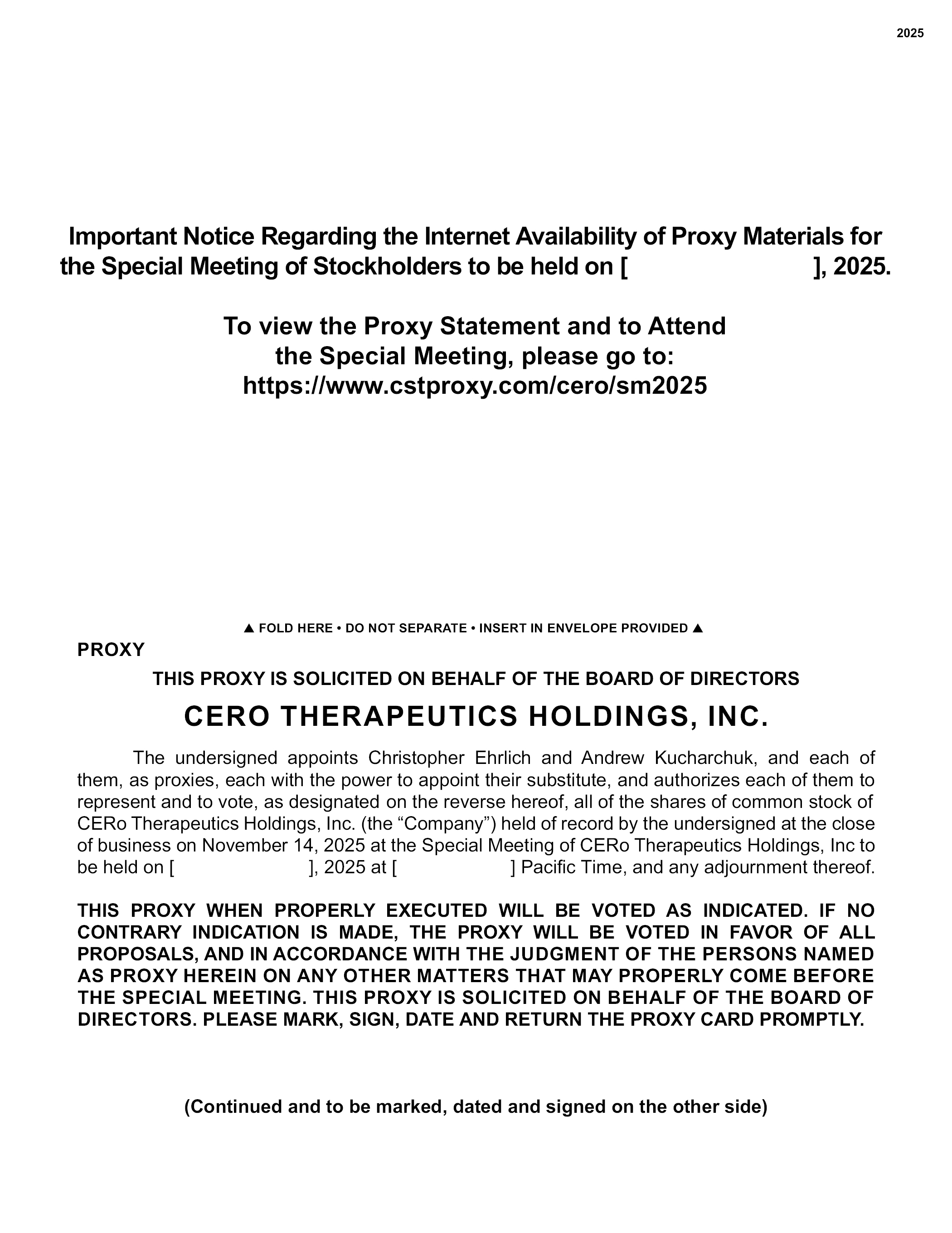2025 Important Notice Regarding the Internet Availability of Proxy Materials for the Special Meeting of Stockholders to be held on [ ], 2025. To view the Proxy Statement and to Attend the Special Meeting, please go to: https://www.cstproxy.com/cero/sm2025 FOLD HERE DO NOT SEPARATE INSERT IN ENVELOPE PROVIDED PROXY THIS PROXY IS SOLICITED ON BEHALF OF THE BOARD OF DIRECTORS CERO THERAPEUTICS HOLDINGS, INC. The undersigned appoints Christopher Ehrlich and Andrew Kucharchuk, and each of them, as proxies, each with the power to appoint their substitute, and authorizes each of them to represent and to vote, as designated on the reverse hereof, all of the shares of common stock of CERo Therapeutics Holdings, Inc. (the “Company”) held of record by the undersigned at the close of business on November 14, 2025 at the Special Meeting of CERo Therapeutics Holdings, Inc to be held on [ ], 2025 at [ ] Pacific Time, and any adjournment thereof. THIS PROXY WHEN PROPERLY EXECUTED WILL BE VOTED AS INDICATED. IF NO CONTRARY INDICATION IS MADE, THE PROXY WILL BE VOTED IN FAVOR OF ALL PROPOSALS, AND IN ACCORDANCE WITH THE JUDGMENT OF THE PERSONS NAMED AS PROXY HEREIN ON ANY OTHER MATTERS THAT MAY PROPERLY COME BEFORE THE SPECIAL MEETING. THIS PROXY IS SOLICITED ON BEHALF OF THE BOARD OF DIRECTORS. PLEASE MARK, SIGN, DATE AND RETURN THE PROXY CARD PROMPTLY. (Continued and to be marked, dated and signed on the other side)