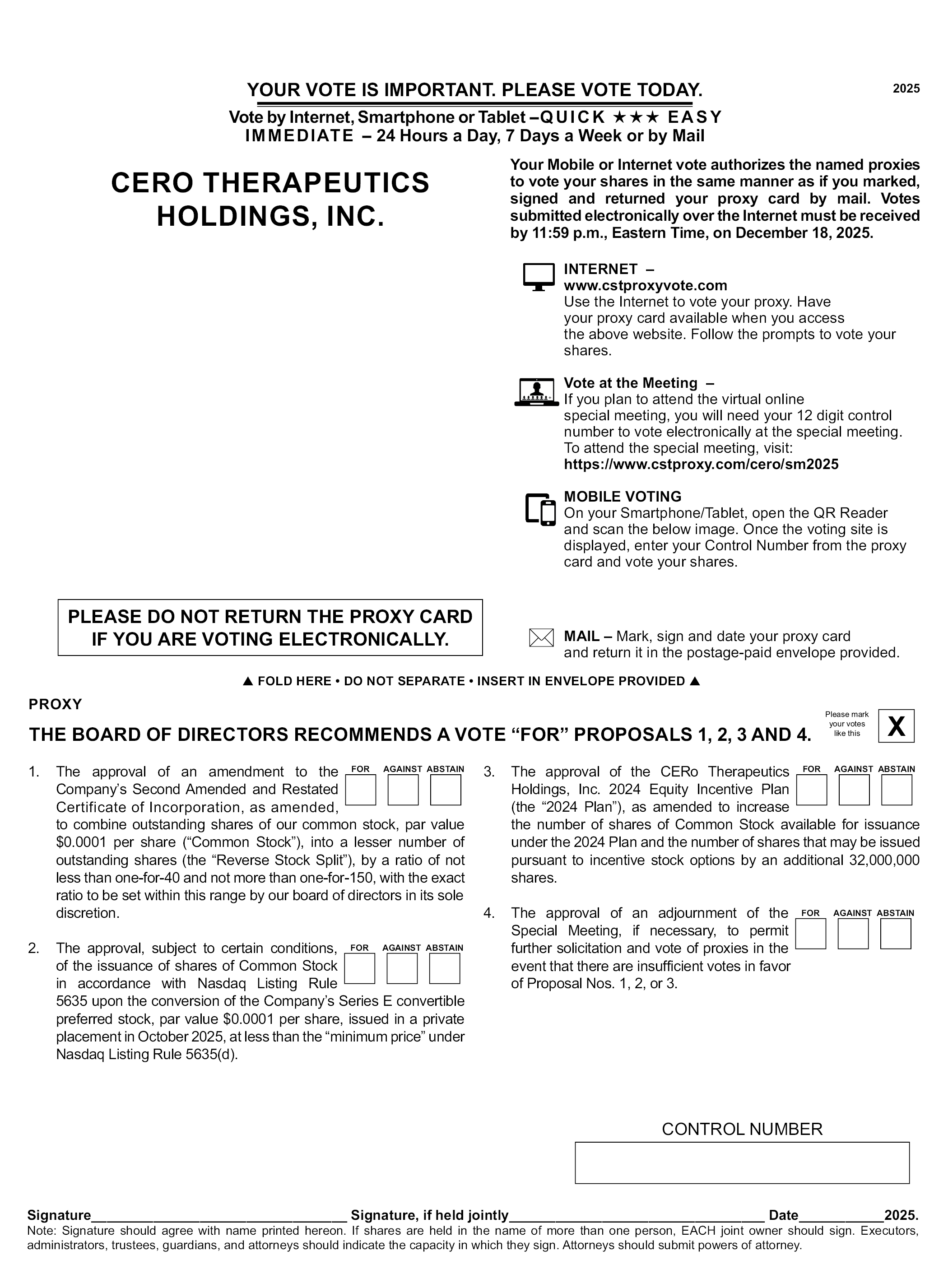 YOUR VOTE IS IMPORTANT. PLEASE VOTE TODAY. 2025 Vote by Internet, Smartphone or Tablet - QUICK EASY IMMEDIATE - 24 Hours a Day, 7 Days a Week or by Mail 2025 CERO THERAPEUTICS HOLDINGS, INC. INTERNET – www.cstproxyvote.com Use the Internet to vote your proxy. Have your proxy card available when you access the above website. Follow the prompts to vote your shares. Vote at the Meeting – If you plan to attend the virtual online special meeting, you will need your 12 digit control number to vote electronically at the special meeting. To attend the special meeting, visit: https://www.cstproxy.com/cero/sm2025 MOBILE VOTING On your Smartphone/Tablet, open the QR Reader and scan the below image. Once the voting site is displayed, enter your Control Number from the proxy card and vote your shares. Your Mobile or Internet vote authorizes the named proxies to vote your shares in the same manner as if you marked, signed and returned your proxy card by mail. Votes submitted electronically over the Internet must be received by 11:59 p.m., Eastern Time, on December 18, 2025. PLEASE DO NOT RETURN THE PROXY CARD IF YOU ARE VOTING ELECTRONICALLY. MAIL – Mark, sign and date your proxy card and return it in the postage-paid envelope provided. FOLD HERE DO NOT SEPARATE INSERT IN ENVELOPE PROVIDED Please mark your votes like this X PROXY THE BOARD OF DIRECTORS RECOMMENDS A VOTE “FOR” PROPOSALS 1, 2, 3 AND 4. 1. The approval of an amendment to the Company’s Second Amended and Restated Certificate of Incorporation, as amended, to combine outstanding shares of our common stock, par value $0.0001 per share (“Common Stock”), into a lesser number of outstanding shares (the “Reverse Stock Split”), by a ratio of not less than one-for-40 and not more than one-for-150, with the exact ratio to be set within this range by our board of directors in its sole discretion. 2. The approval, subject to certain conditions, of the issuance of shares of Common Stock in accordance with Nasdaq Listing Rule 5635 upon the conversion of the Company’s Series E convertible preferred stock, par value $0.0001 per share, issued in a private placement in October 2025, at less than the “minimum price” under Nasdaq Listing Rule 5635(d). FOR AGAINST ABSTAIN FOR AGAINST ABSTAIN 3. The approval of the CERo Therapeutics Holdings, Inc. 2024 Equity Incentive Plan (the “2024 Plan”), as amended to increase the number of shares of Common Stock available for issuance under the 2024 Plan and the number of shares that may be issued pursuant to incentive stock options by an additional 32,000,000 shares. 4. The approval of an adjournment of the Special Meeting, if necessary, to permit further solicitation and vote of proxies in the event that there are insufficient votes in favor of Proposal Nos. 1, 2, or 3. FOR AGAINST ABSTAIN FOR AGAINST ABSTAIN CONTROL NUMBER Signature Signature, if held jointly Date 2025. Note: Signature should agree with name printed hereon. If shares are held in the name of more than one person, EACH joint owner should sign. Executors, administrators, trustees, guardians, and attorneys should indicate the capacity in which they sign. Attorneys should submit powers of attorney.