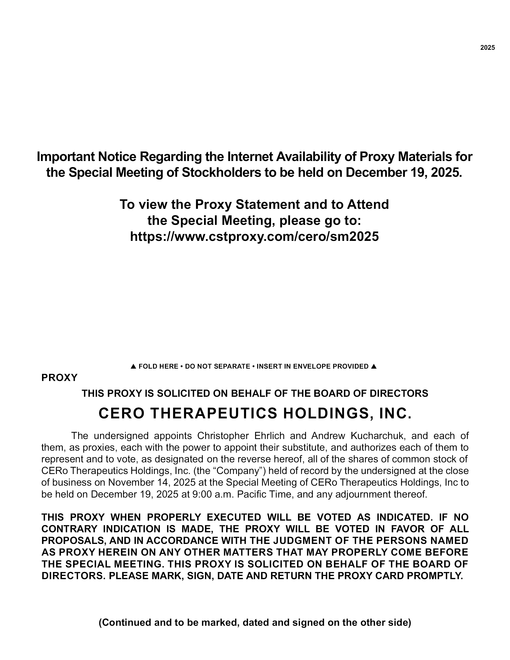 2025 Important Notice Regarding the Internet Availability of Proxy Materials for the Special Meeting of Stockholders to be held on December 19, 2025. To view the Proxy Statement and to Attend the Special Meeting, please go to: https://www.cstproxy.com/cero/sm2025 FOLD HERE DO NOT SEPARATE INSERT IN ENVELOPE PROVIDED PROXY THIS PROXY IS SOLICITED ON BEHALF OF THE BOARD OF DIRECTORS CERO THERAPEUTICS HOLDINGS, INC. The undersigned appoints Christopher Ehrlich and Andrew Kucharchuk, and each of them, as proxies, each with the power to appoint their substitute, and authorizes each of them to represent and to vote, as designated on the reverse hereof, all of the shares of common stock of CERo Therapeutics Holdings, Inc. (the “Company”) held of record by the undersigned at the close of business on November 14, 2025 at the Special Meeting of CERo Therapeutics Holdings, Inc to be held on December 19, 2025 at 9:00 a.m. Pacific Time, and any adjournment thereof. THIS PROXY WHEN PROPERLY EXECUTED WILL BE VOTED AS INDICATED. IF NO CONTRARY INDICATION IS MADE, THE PROXY WILL BE VOTED IN FAVOR OF ALL PROPOSALS, AND IN ACCORDANCE WITH THE JUDGMENT OF THE PERSONS NAMED AS PROXY HEREIN ON ANY OTHER MATTERS THAT MAY PROPERLY COME BEFORE THE SPECIAL MEETING. THIS PROXY IS SOLICITED ON BEHALF OF THE BOARD OF DIRECTORS. PLEASE MARK, SIGN, DATE AND RETURN THE PROXY CARD PROMPTLY. (Continued and to be marked, dated and signed on the other side)