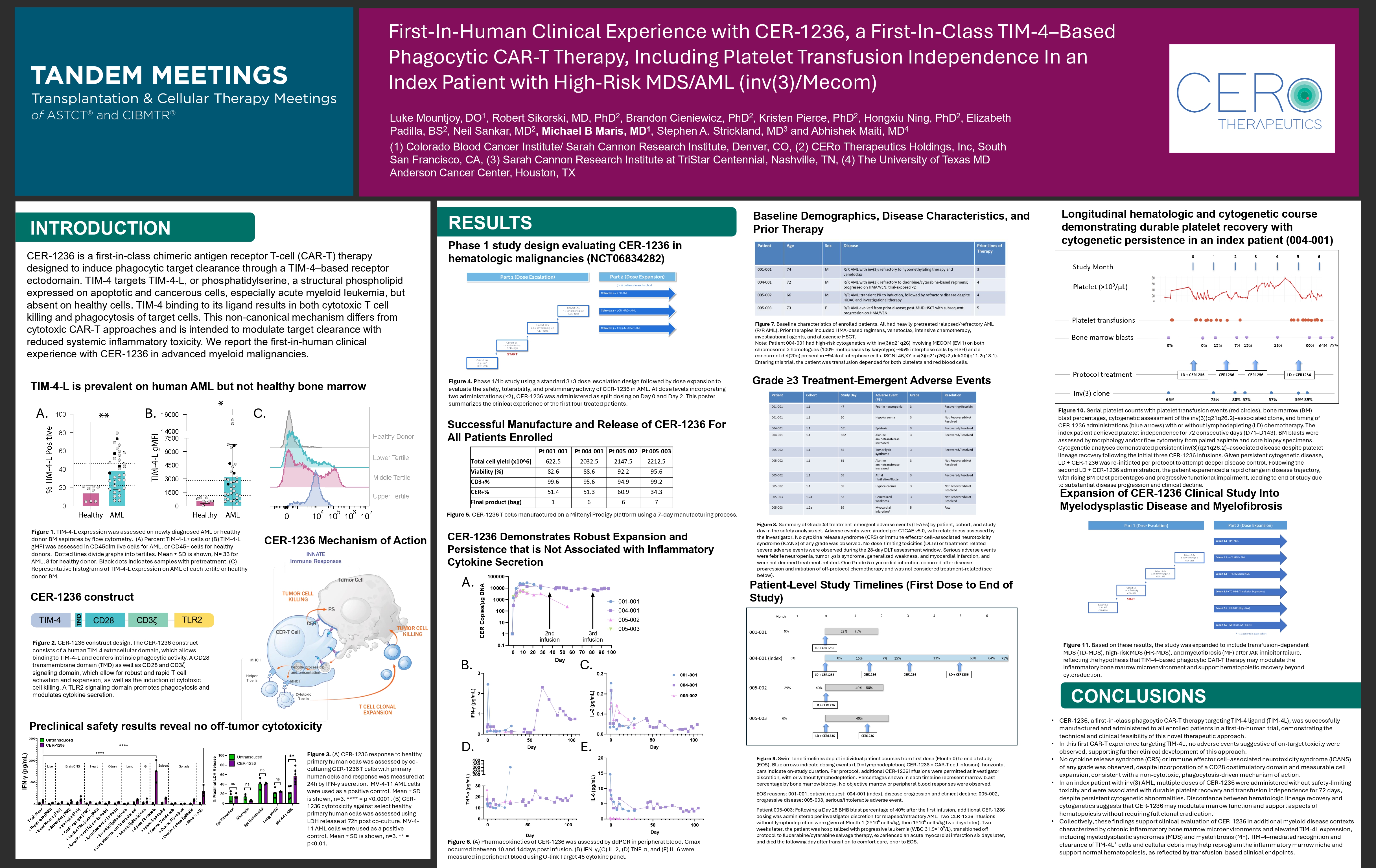CER - 1236 is a first - in - class chimeric antigen receptor T - cell (CAR - T) therapy designed to induce phagocytic target clearance through a TIM - 4 – based receptor ectodomain. TIM - 4 targets TIM - 4 - L, or phosphatidylserine, a structural phospholipid expressed on apoptotic and cancerous cells, especially acute myeloid leukemia, but absent on healthy cells. TIM - 4 binding to its ligand results in both cytotoxic T cell killing and phagocytosis of target cells. This non - canonical mechanism differs from cytotoxic CAR - T approaches and is intended to modulate target clearance with reduced systemic inflammatory toxicity. We report the first - in - human clinical experience with CER - 1236 in advanced myeloid malignancies. INTRODUCTION ϙϙϙϙϙϙϙϙ First - In - Human Clinical Experience with CER - 1236, a First - In - Class TIM - 4 – Based Phagocytic CAR - T Therapy, Including Platelet Transfusion Independence In an Index Patient with High - Risk MDS/AML (inv(3)/Mecom) 5(68/76 Preclinical safety results reveal no off - tumor cytotoxicity Figure 3. (A) CER - 1236 response to healthy primary human cells was assessed by co - culturing CER - 1236 T cells with primary human cells and response was measured at 24h by IFN - γ secretion. MV - 4 - 11 AML cells were used as a positive control. Mean ± SD is shown, n=3. **** = p <0.0001. (B) CER - 1236 cytotoxicity against select healthy primary human cells was assessed using LDH release at 72h post co - culture. MV - 4 - 11 AML cells were used as a positive control. Mean ± SD is shown, n=3. ** = p<0.01. 7,0 /LVSUHYDOHQWRQKXPDQ$0/EXWQRWKHDOWK\ERQHPDUURZ Figure 1. TIM - 4 - L expression was assessed on newly diagnosed AML or healthy donor BM aspirates by flow cytometry. (A) Percent TIM - 4 - L+ cells or (B) TIM - 4 - L gMFI was assessed in CD45dim live cells for AML, or CD45+ cells for healthy donors. Dotted lines divide graphs into tertiles. Mean ± SD is shown, N= 33 for AML, 8 for healthy donor. Black dots indicates samples with pretreatment. (C) Representative histograms of TIM - 4 - L expression on AML of each tertile or healthy donor BM. A. ϟ C. &(5 FRQVWUXFW Figure 2. CER - 1236 construct design. The CER - 1236 construct consists of a human TIM - 4 extracellular domain, which allows binding to TIM - 4 - L and confers intrinsic phagocytic activity. A CD28 transmembrane domain (TMD) as well as CD28 and CD3 ζ signaling domain, which allow for robust and rapid T cell activation and expansion, as well as the induction of cytotoxic cell killing. A TLR2 signaling domain promotes phagocytosis and modulates cytokine secretion. TMD &(5 0HFKDQLVPRI$FWLRQ CONCLUSIONS • CER - 1236, a first - in - class phagocytic CAR - T therapy targeting TIM - 4 ligand (TIM - 4L), was successfully manufactured and administered to all enrolled patients in a first - in - human trial, demonstrating the technical and clinical feasibility of this novel therapeutic approach. • In this first CAR - T experience targeting TIM - 4L, no adverse events suggestive of on - target toxicity were observed, supporting further clinical development of this approach. • No cytokine release syndrome (CRS) or immune effector cell – associated neurotoxicity syndrome (ICANS) of any grade was observed, despite incorporation of a CD28 costimulatory domain and measurable cell expansion, consistent with a non - cytotoxic, phagocytosis - driven mechanism of action. • In an index patient with inv(3) AML, multiple doses of CER - 1236 were administered without safety - limiting toxicity and were associated with durable platelet recovery and transfusion independence for 72 days, despite persistent cytogenetic abnormalities. Discordance between hematologic lineage recovery and cytogenetics suggests that CER - 1236 may modulate marrow function and support aspects of hematopoiesis without requiring full clonal eradication. • Collectively, these findings support clinical evaluation of CER - 1236 in additional myeloid disease contexts characterized by chronic inflammatory bone marrow microenvironments and elevated TIM - 4L expression, including myelodysplastic syndromes (MDS) and myelofibrosis (MF). TIM - 4 – mediated recognition and clearance of TIM - 4L ⁺ cells and cellular debris may help reprogram the inflammatory marrow niche and support normal hematopoiesis, as reflected by transfusion - based clinical endpoints. >ĖČŪŘôϙ ͖ ϟ ϙ ÍŜôīĖIJôϙèēÍŘÍèťôŘĖŜťĖèŜϙĺċϙôIJŘĺīīôîϙŕÍťĖôIJťŜϟϙīīϙēÍîϙēôÍŽĖīƅϙŕŘôťŘôÍťôîϙŘôīÍŕŜôîϯŘôċŘÍèťĺŘƅϙa[ϙ ϼ‡ϯ‡ϙa[Ͻϟϙ„ŘĖĺŘϙťēôŘÍŕĖôŜϙĖIJèīŪîôîϙFa ϱ æÍŜôîϙŘôČĖıôIJŜϠϙŽôIJôťĺèīÍƄϠϙĖIJťôIJŜĖŽôϙèēôıĺťēôŘÍŕƅϠϙ ĖIJŽôŜťĖČÍťĖĺIJÍīϙÍČôIJťŜϠϙÍIJîϙÍīīĺČôIJôĖèϙF‹“ϟ bĺťôϡϙ„ÍťĖôIJťϙ ͏͏͓ ϱ ͏͏͐ϙ ēÍîϙēĖČē ϱ ŘĖŜħϙèƅťĺČôIJôťĖèŜϙſĖťēϙĖIJŽϼ ͒ Ͻϼŗ ͑͐ ŗ ͕͑ ϽϙĖIJŽĺīŽĖIJČϙa(iaϙϼ(«I ͐ ϽϙĺIJϙæĺťēϙ èēŘĺıĺŜĺıôϙ ͒ϙ ēĺıĺīĺČŪôŜϙϼ ͐͏͏ ҇ϙıôťÍŕēÍŜôŜϙæƅϙħÍŘƅĺťƅŕôϢϙѹ ͕͔ ҇ϙĖIJťôŘŕēÍŜôϙèôīīŜϙæƅϙ>I‹FϽϙÍIJîϙÍϙ èĺIJèŪŘŘôIJťϙîôīϼ ͑͏ ŗϽϙŕŘôŜôIJťϙĖIJϙѹ ͓͘ ҇ϙĺċϙĖIJťôŘŕēÍŜôϙèôīīŜϟϙI‹bϡϙ ͓͕ Ϡ³´ϠĖIJŽϼ ͒ Ͻϼŗ ͑͐ ŗ ͕͑ ϽƄ ͑ Ϡîôīϼ ͑͏ Ͻϼŗ ͐͐ϟ͑ ŗ ͐͒ϟ͐ Ͻϟϙ (IJťôŘĖIJČϙťēĖŜϙťŘĖÍīϠϙťēôϙŕÍťĖôIJťϙſÍŜϙťŘÍIJŜċŪŜĖĺIJϙîôŕôIJîôîϙċĺŘϙæĺťēϙŕīÍťôīôťŜϙÍIJîϙŘôîϙæīĺĺîϙèôīīŜϟ Figure 8. Summary of Grade ≥3 treatment - emergent adverse events (TEAEs) by patient, cohort, and study day in the safety analysis set. Adverse events were graded per CTCAE v5.0, with relatedness assessed by the investigator. No cytokine release syndrome (CRS) or immune effector cel