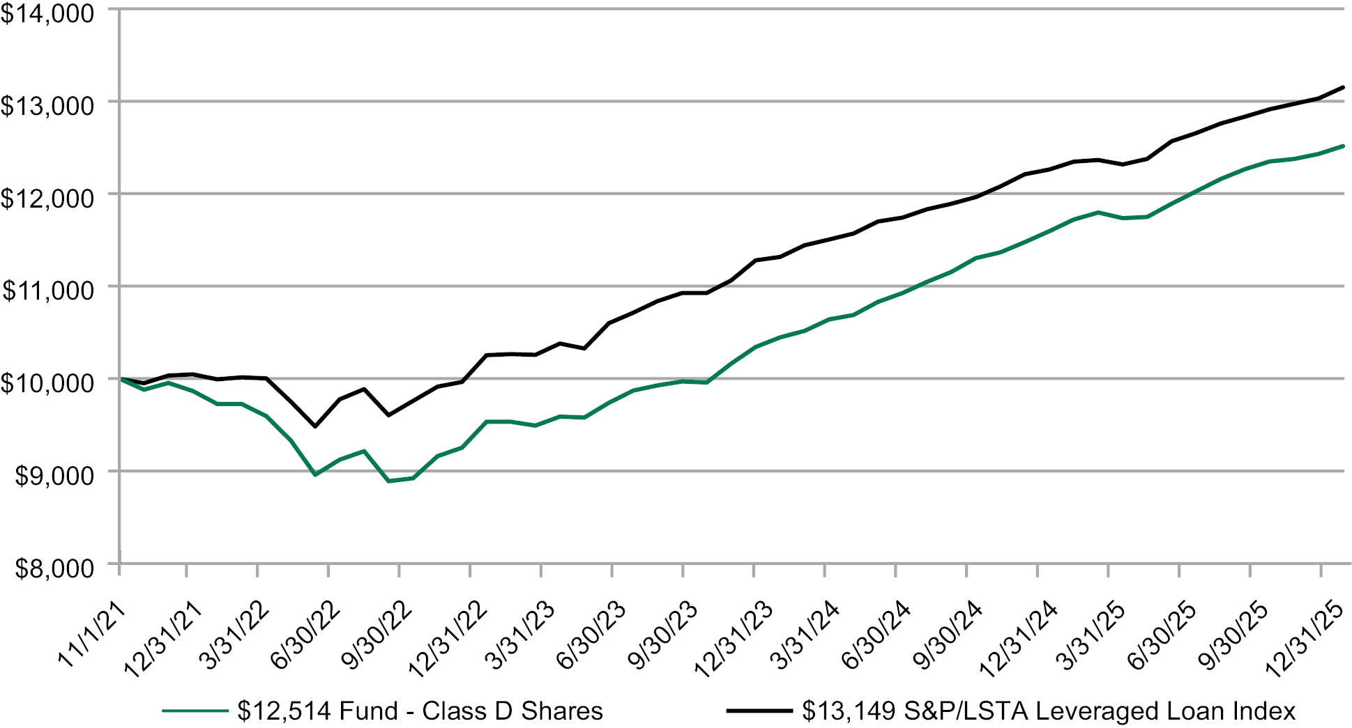 The graph below illustrates a hypothetical investment of $10,000 in the Fund from the commencement of investment operations on November 1, 2021 to December 31, 2025 compared to the S&P/LSTA Leverage Loan Index.