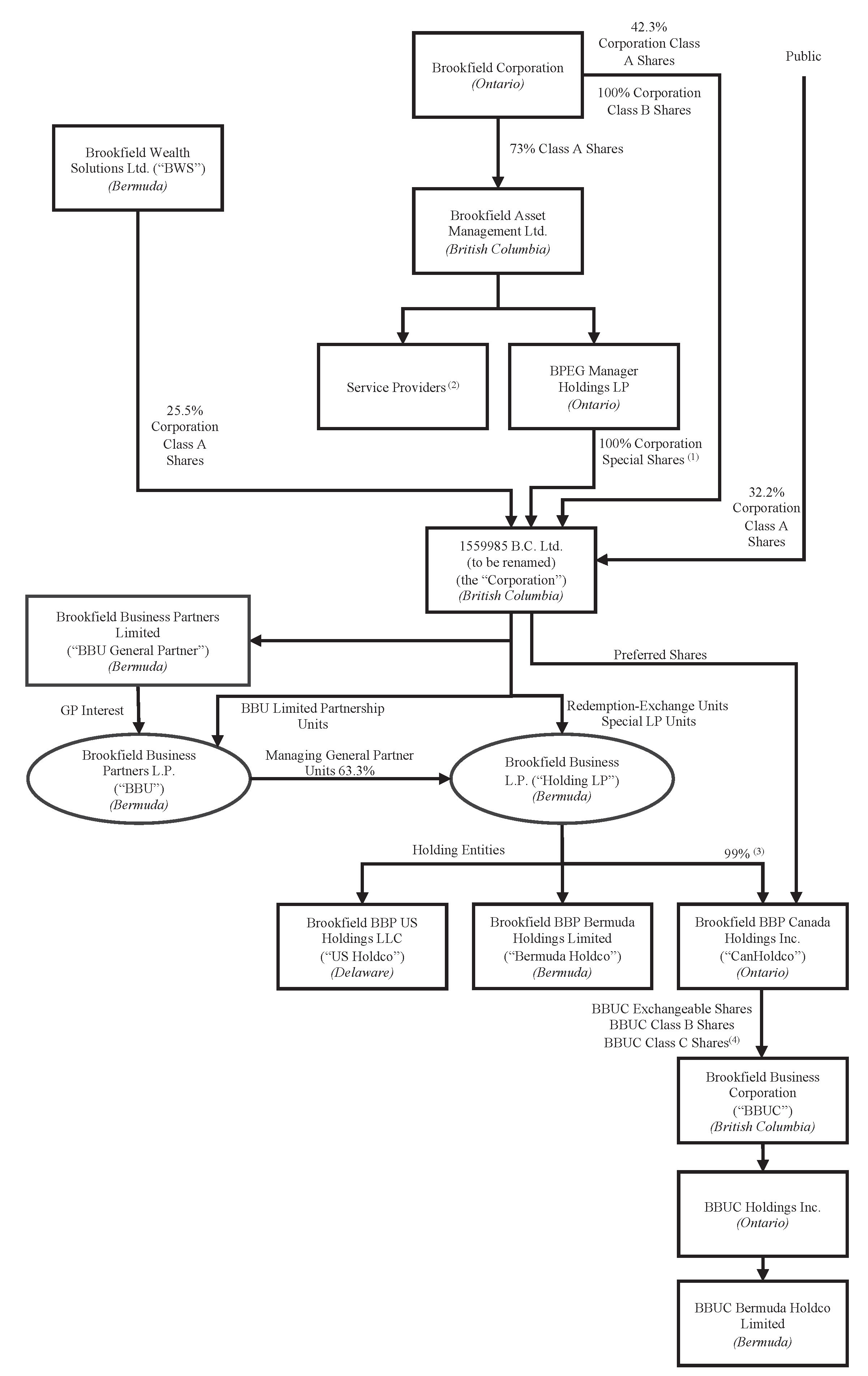 Based on the outstanding BBU units, REUs and BBUC exchangeable shares as of November 25, 2025, the Corporation would have outstanding 210,272,380 Corporation Class A Shares, 4 Corporation Class B Shares and 4 Corporation Special Shares immediately following completion of the Arrangement. It is currently anticipated that (i) Brookfield and Brookfield Wealth Solutions Ltd. (“BWS”) will hold 88,901,378 and 53,651,499, respectively, of the issued and outstanding Corporation Class A Shares, with 67,719,503 Corporation Class A Shares held by public shareholders, (ii) Brookfield will hold 4 Corporation Class B Shares, and (iii) a subsidiary of BAM will hold 4 Corporation Special Shares.