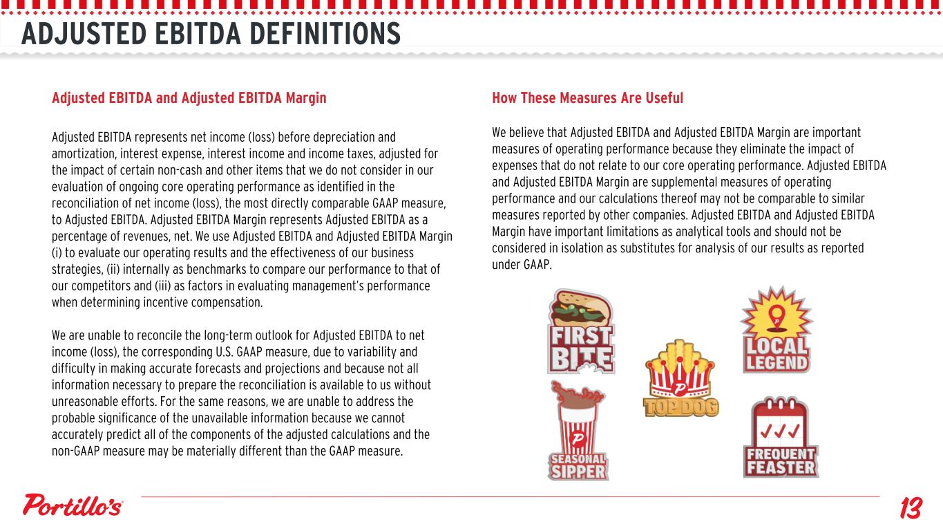 RESTAURANT-LEVEL ADJUSTED EBITDA DEFINITIONS Restaurant-Level Adjusted EBITDA and Restaurant-Level Adjusted EBITDA Margin Restaurant-Level Adjusted EBITDA is defined as revenue, less restaurant operating expenses, which include food, beverage and packaging costs, labor expenses, occupancy expenses and other operating expenses. Restaurant-Level Adjusted EBITDA excludes corporate level expenses, pre-opening expenses and depreciation and amortization on restaurant property and equipment. Restaurant-Level Adjusted EBITDA Margin represents Restaurant-Level Adjusted EBITDA as a percentage of revenues, net. How These Measures Are Useful We believe that Restaurant-Level Adjusted EBITDA and Restaurant-Level Adjusted EBITDA Margin are important measures to evaluate the performance and profitability of our restaurants, individually and in the aggregate. Restaurant- Level Adjusted EBITDA and Restaurant-Level Adjusted EBITDA Margin have limitations as analytical tools and should not be considered as a substitute for analysis of our results as reported under GAAP. Limitations of the Usefulness of This Measure Restaurant-Level Adjusted EBITDA and Restaurant-Level Adjusted EBITDA Margin are not required by, nor presented in accordance with GAAP. Rather, Restaurant- Level Adjusted EBITDA and Restaurant-Level Adjusted EBITDA Margin are supplemental measures of operating performance of our restaurants. You should be aware that Restaurant-Level Adjusted EBITDA and Restaurant-Level Adjusted EBITDA Margin are not indicative of overall results for the Company, and Restaurant-Level Adjusted EBITDA and Restaurant-Level Adjusted EBITDA Margin do not accrue directly to the benefit of stockholders because of corporate-level expenses excluded from such measures. In addition, our calculations thereof may not be comparable to similar measures reported by other companies.