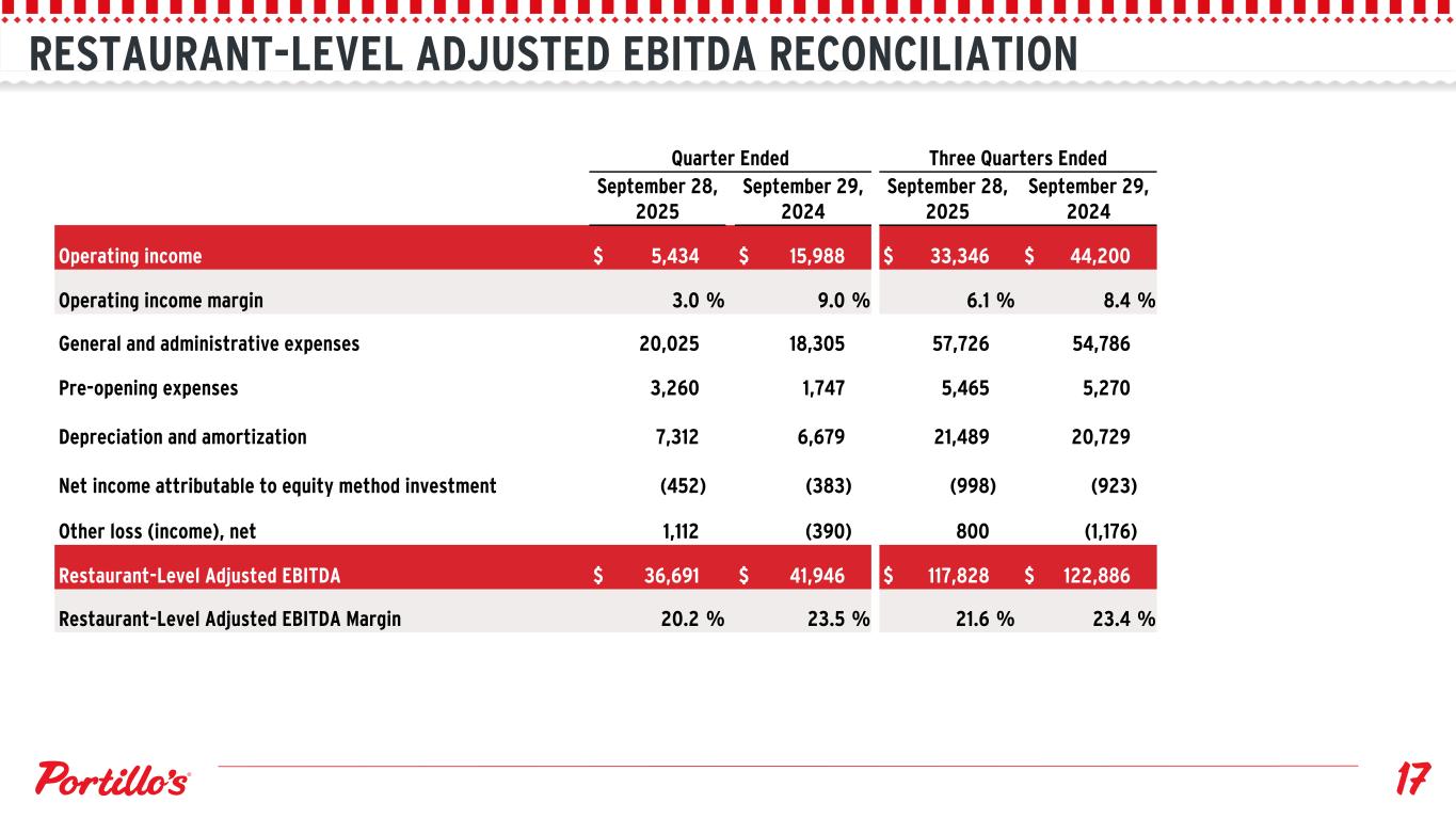 STATEMENT OF OPERATIONS Quarter Ended Three Quarters Ended September 28, 2025 September 29, 2024 September 28, 2025 September 29, 2024 REVENUES, NET $ 181,428 100.0 % $ 178,252 100.0 % $ 546,321 100.0 % $ 525,945 100.0 % COST AND EXPENSES: Restaurant operating expenses: Food, beverage and packaging costs 62,619 34.5 % 60,136 33.7 % 187,471 34.3 % 178,809 34.0 % Labor 48,263 26.6 % 45,945 25.8 % 143,471 26.3 % 135,659 25.8 % Occupancy 10,524 5.8 % 9,172 5.1 % 30,511 5.6 % 27,723 5.3 % Other operating expenses 23,331 12.9 % 21,053 11.8 % 67,040 12.3 % 60,868 11.6 % Total restaurant operating expenses 144,737 79.8 % 136,306 76.5 % 428,493 78.4 % 403,059 76.6 % General and administrative expenses 20,025 11.0 % 18,305 10.3 % 57,726 10.6 % 54,786 10.4 % Pre-opening expenses 3,260 1.8 % 1,747 1.0 % 5,465 1.0 % 5,270 1.0 % Depreciation and amortization 7,312 4.0 % 6,679 3.7 % 21,489 3.9 % 20,729 3.9 % Net income attributable to equity method investment (452) (0.2) % (383) (0.2) % (998) (0.2) % (923) (0.2) % Other loss (income), net 1,112 0.6 % (390) (0.2) % 800 0.1 % (1,176) (0.2) % OPERATING INCOME 5,434 3.0 % 15,988 9.0 % 33,346 6.1 % 44,200 8.4 % Interest expense 5,664 3.1 % 6,450 3.6 % 17,139 3.1 % 19,583 3.7 % Interest income (118) (0.1) % (50) — % (268) — % (204) — % Tax Receivable Agreement liability adjustment 353 0.2 % (1,724) (1.0) % (2,132) (0.4) % (2,724) (0.5) % (LOSS) INCOME BEFORE INCOME TAXES (465) (0.3) % 11,312 6.3 % 18,607 3.4 % 27,545 5.2 % Income tax (benefit) expense (1,247) (0.7) % 2,539 1.4 % 3,792 0.7 % 4,898 0.9 % NET INCOME 782 0.4 % 8,773 4.9 % 14,815 2.7 % 22,647 4.3 % Net (loss) income attributable to non-controlling interests (432) (0.2) % 1,553 0.9 % 1,584 0.3 % 4,395 0.8 % NET INCOME ATTRIBUTABLE TO PORTILLO'S INC. $ 1,214 0.7 % $ 7,220 4.1 % $ 13,231 2.4 % $ 18,252 3.5 % Income per common share attributable to Portillo’s Inc.: Basic $ 0.02 $ 0.12 $ 0.20 $ 0.30 Diluted $ 0.02 $ 0.11 $ 0.19 $ 0.29 Weighted-average common shares outstanding: Basic 71,908,534 61,921,564 67,780,566 60,336,488 Diluted 73,973,710 64,894,558 70,131,466 63,347,715