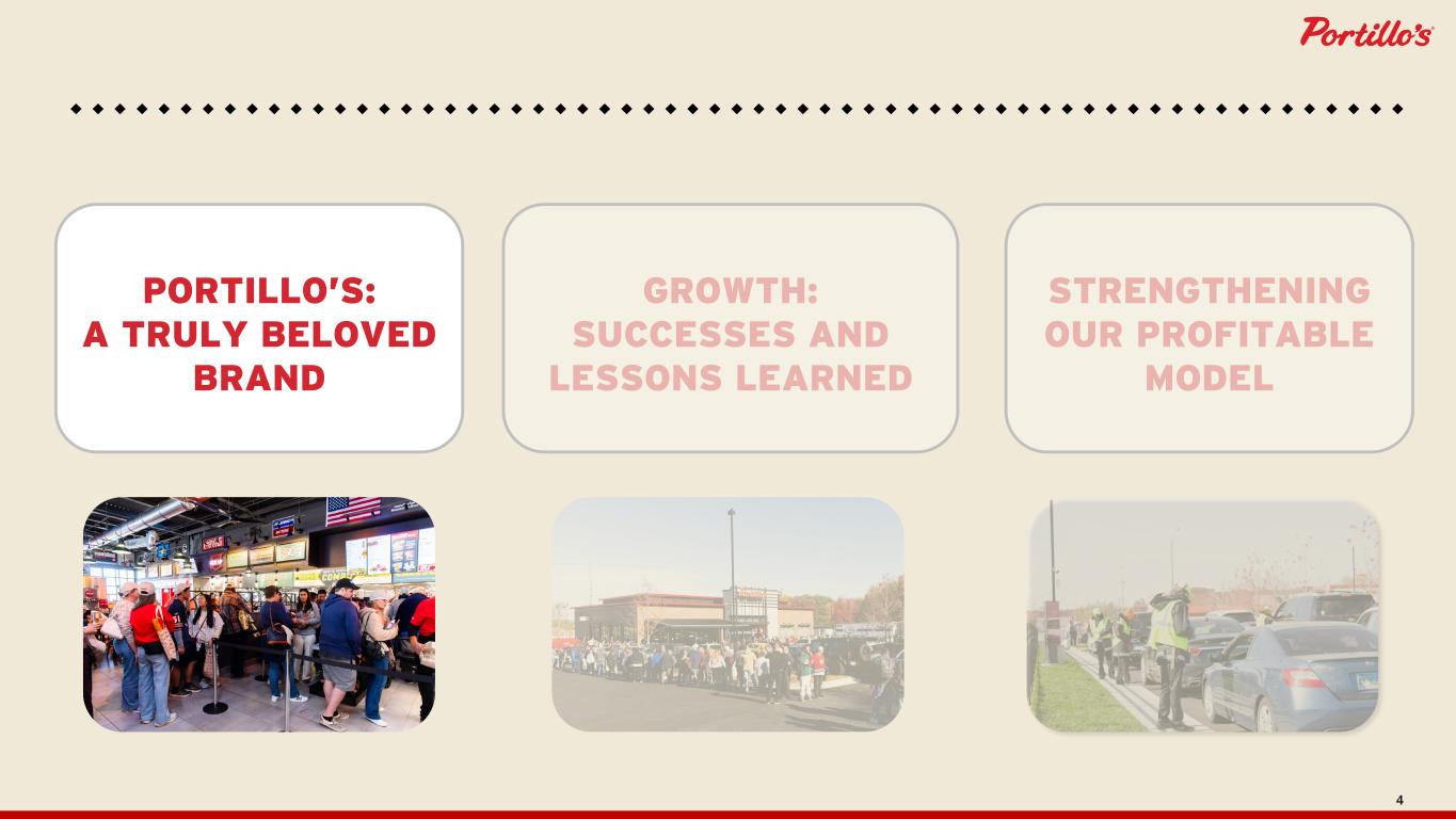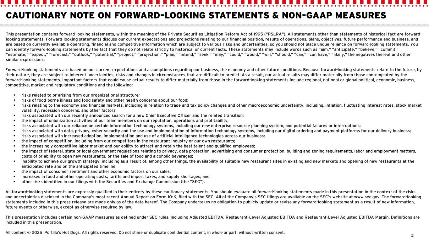 2 CAUTIONARY NOTE ON FORWARD-LOOKING STATEMENTS & NON-GAAP MEASURES This presentation contains forward-looking statements, within the meaning of the Private Securities Litigation Reform Act of 1995 ("PSLRA"). All statements other than statements of historical fact are forward- looking statements. Forward-looking statements discuss our current expectations and projections relating to our financial position, results of operations, plans, objectives, future performance and business, and are based on currently available operating, financial and competitive information which are subject to various risks and uncertainties, so you should not place undue reliance on forward-looking statements. You can identify forward-looking statements by the fact that they do not relate strictly to historical or current facts. These statements may include words such as "aim," "anticipate," "believe," "commit," "estimate," "expect," "forecast," "outlook," "potential," "project," "projection," "plan," "intend," "seek," "may," "could," "would," "will," "should," "can," "can have," "likely," the negatives thereof and other similar expressions. Forward-looking statements are based on our current expectations and assumptions regarding our business, the economy and other future conditions. Because forward-looking statements relate to the future, by their nature, they are subject to inherent uncertainties, risks and changes in circumstances that are difficult to predict. As a result, our actual results may differ materially from those contemplated by the forward-looking statements. Important factors that could cause actual results to differ materially from those in the forward-looking statements include regional, national or global political, economic, business, competitive, market and regulatory conditions and the following: • risks related to or arising from our organizational structure; • risks of food-borne illness and food safety and other health concerns about our food; • risks relating to the economy and financial markets, including in relation to trade and tax policy changes and other macroeconomic uncertainty, including, inflation, fluctuating interest rates, stock market volatility, recession concerns, and other factors; • risks associated with our recently announced search for a new Chief Executive Officer and the related transition; • the impact of unionization activities of our team members on our reputation, operations and profitability; • risks associated with our reliance on certain information technology systems, including our new enterprise resource planning system, and potential failures or interruptions; • risks associated with data, privacy, cyber security and the use and implementation of information technology systems, including our digital ordering and payment platforms for our delivery business; • risks associated with increased adoption, implementation and use of artificial intelligence technologies across our business; • the impact of competition, including from our competitors in the restaurant industry or our own restaurants; • the increasingly competitive labor market and our ability to attract and retain the best talent and qualified employees; • the impact of federal, state or local government regulations relating to privacy, data protection, advertising and consumer protection, building and zoning requirements, labor and employment matters, costs of or ability to open new restaurants, or the sale of food and alcoholic beverages; • inability to achieve our growth strategy, including as a result of, among other things, the availability of suitable new restaurant sites in existing and new markets and opening of new restaurants at the anticipated rate and on the anticipated timeline; • the impact of consumer sentiment and other economic factors on our sales; • increases in food and other operating costs, tariffs and import taxes, and supply shortages; and • other risks identified in our filings with the Securities and Exchange Commission (the “SEC”). All forward-looking statements are expressly qualified in their entirety by these cautionary statements. You should evaluate all forward-looking statements made in this presentation in the context of the risks and uncertainties disclosed in the Company’s most recent Annual Report on Form 10-K, filed with the SEC. All of the Company’s SEC filings are available on the SEC’s website at www.sec.gov. The forward-looking statements included in this press release are made only as of the date hereof. The Company undertakes no obligation to publicly update or revise any forward-looking statement as a result of new information, future events or otherwise, except as otherwise required by law. This presentation includes certain non-GAAP measures as defined under SEC rules, including Adjusted EBITDA, Restaurant-Level Adjusted EBITDA and Restaurant-Level Adjusted EBITDA Margin. Definitions are included in this presentation. All content © 2025 Portillo’s Hot Dogs. All rights reserved. Do not share or duplicate confidential content, in whole or part, without written consent.