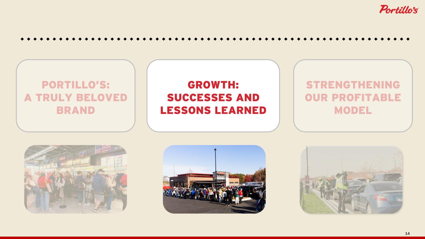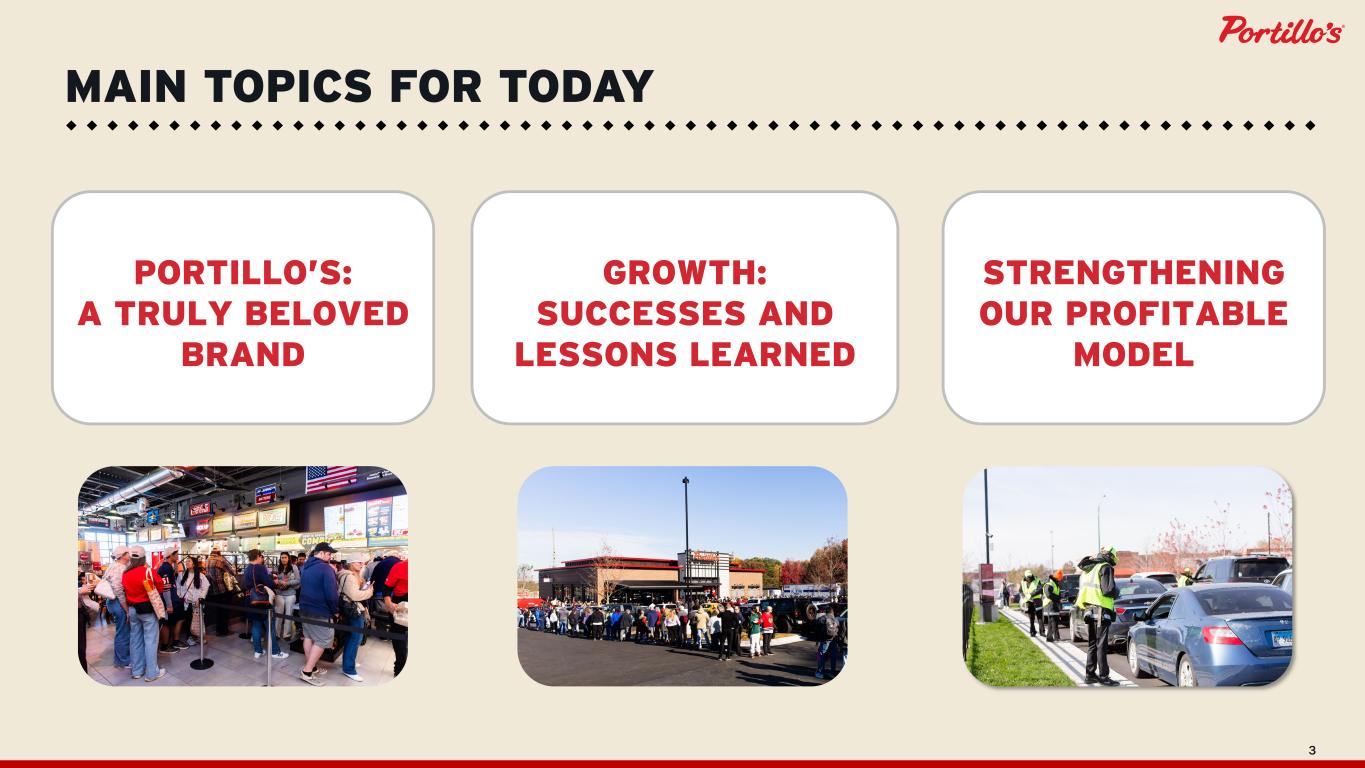 3 MAIN TOPICS FOR TODAY PORTILLO’S: A TRULY BELOVED BRAND GROWTH: SUCCESSES AND LESSONS LEARNED STRENGTHENING OUR PROFITABLE MODEL