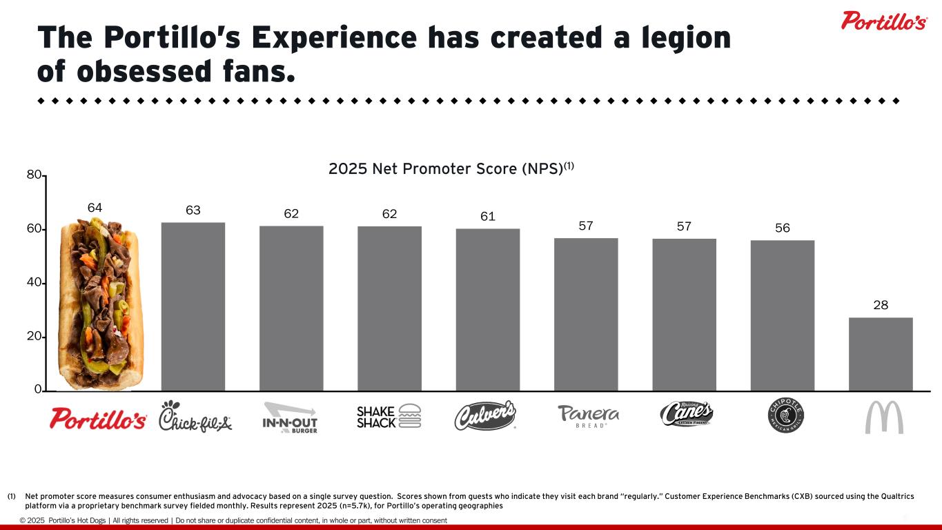 © 2025 Portillo’s Hot Dogs | All rights reserved | Do not share or duplicate confidential content, in whole or part, without written consent 11 Portillo’s fanatics will drive long distances to get their “fix.”