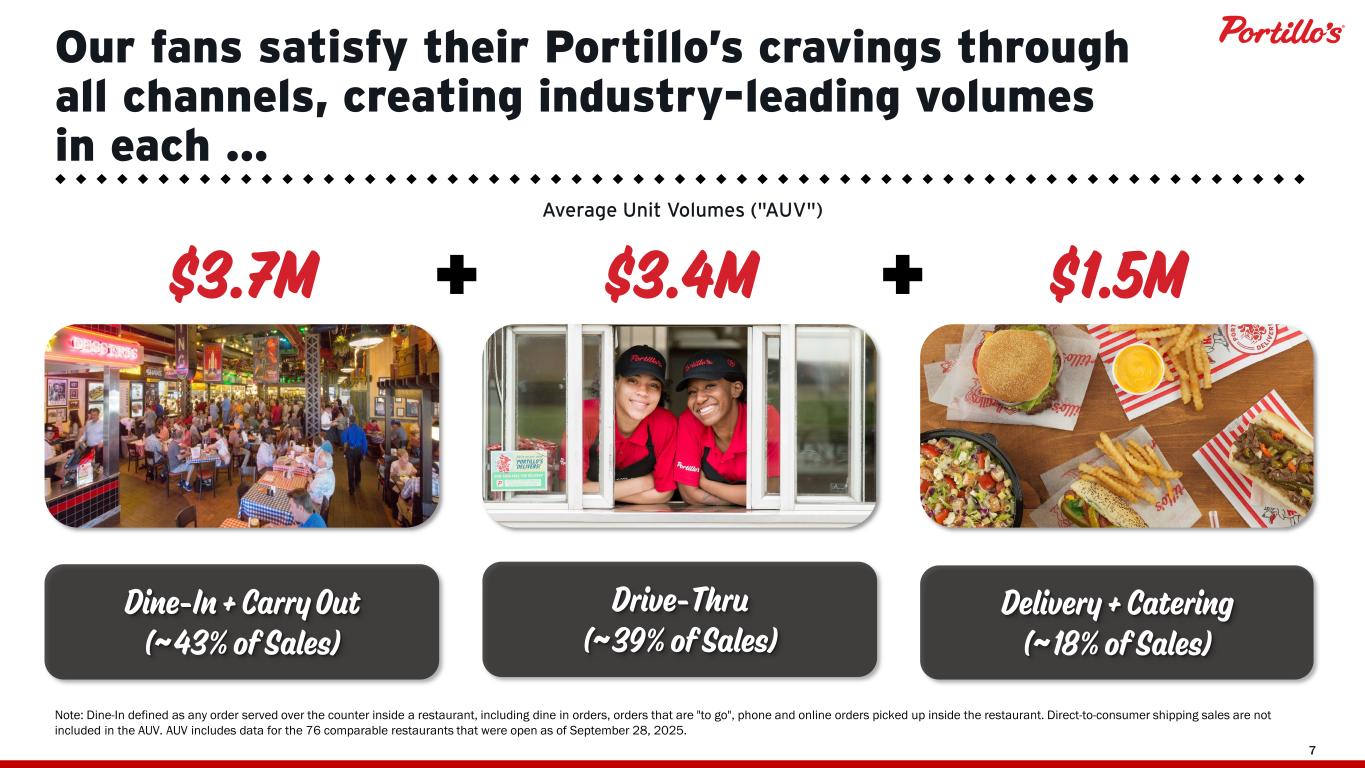 © 2025 Portillo’s Hot Dogs | All rights reserved | Do not share or duplicate confidential content, in whole or part, without written consent 6 0 20 40 60 80 NPS 64 63 62 62 61 57 57 56 28 2025 Net Promoter Score (NPS)(1) (1) Net promoter score measures consumer enthusiasm and advocacy based on a single survey question. Scores shown from guests who indicate they visit each brand “regularly.” Customer Experience Benchmarks (CXB) sourced using the Qualtrics platform via a proprietary benchmark survey fielded monthly. Results represent 2025 (n=5.7k), for Portillo’s operating geographies The Portillo’s Experience has created a legion of obsessed fans.