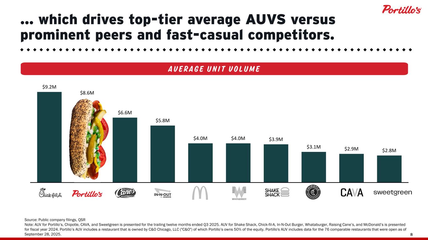 © 2025 Portillo’s Hot Dogs | All rights reserved | Do not share or duplicate confidential content, in whole or part, without written consent 7 Our fans satisfy their Portillo’s cravings through all channels, creating industry-leading volumes in each … Drive-Thru (~39% of Sales) Dine-In + Carry Out (~43% of Sales) Delivery + Catering (~18% of Sales) Note: Dine-In defined as any order served over the counter inside a restaurant, including dine in orders, orders that are "to go", phone and online orders picked up inside the restaurant. Direct-to-consumer shipping sales are not included in the AUV. AUV includes data for the 76 comparable restaurants that were open as of September 28, 2025. $3.7M $3.4M $1.5M Average Unit Volumes ("AUV")