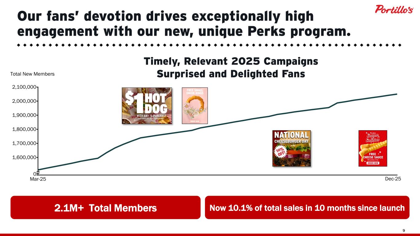© 2025 Portillo’s Hot Dogs | All rights reserved | Do not share or duplicate confidential content, in whole or part, without written consent 8 … which drives top-tier average AUVS versus prominent peers and fast-casual competitors. © 2024 Portillo’s Hot Dogs | All rights reserved | Do not share or duplicate confidential content, in whole or part, without written consent HOME MARKET OUTSIDE HOME MARKET A V E R A G E U N I T V O L U M E $9.2M $8.6M $6.6M $5.8M $4.0M $4.0M $3.9M $3.1M $2.9M $2.8M Source: Public company filings, QSR Note: AUV for Portillo’s, Chipotle, CAVA, and Sweetgreen is presented for the trailing twelve months ended Q3 2025. AUV for Shake Shack, Chick-fil-A, In-N-Out Burger, Whataburger, Raising Cane’s, and McDonald’s is presented for fiscal year 2024. Portillo’s AUV includes a restaurant that is owned by C&O Chicago, LLC ("C&O") of which Portillo’s owns 50% of the equity. Portillo's AUV includes data for the 76 comparable restaurants that were open as of September 28, 2025.