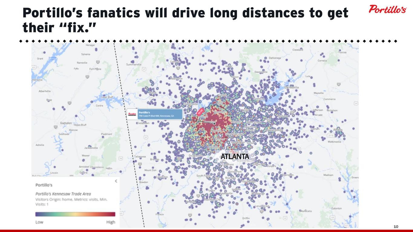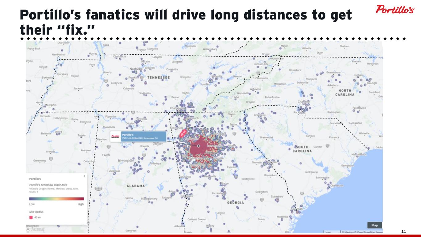 © 2025 Portillo’s Hot Dogs | All rights reserved | Do not share or duplicate confidential content, in whole or part, without written consent 10 Portillo’s fanatics will drive long distances to get their “fix.” ATLANTA