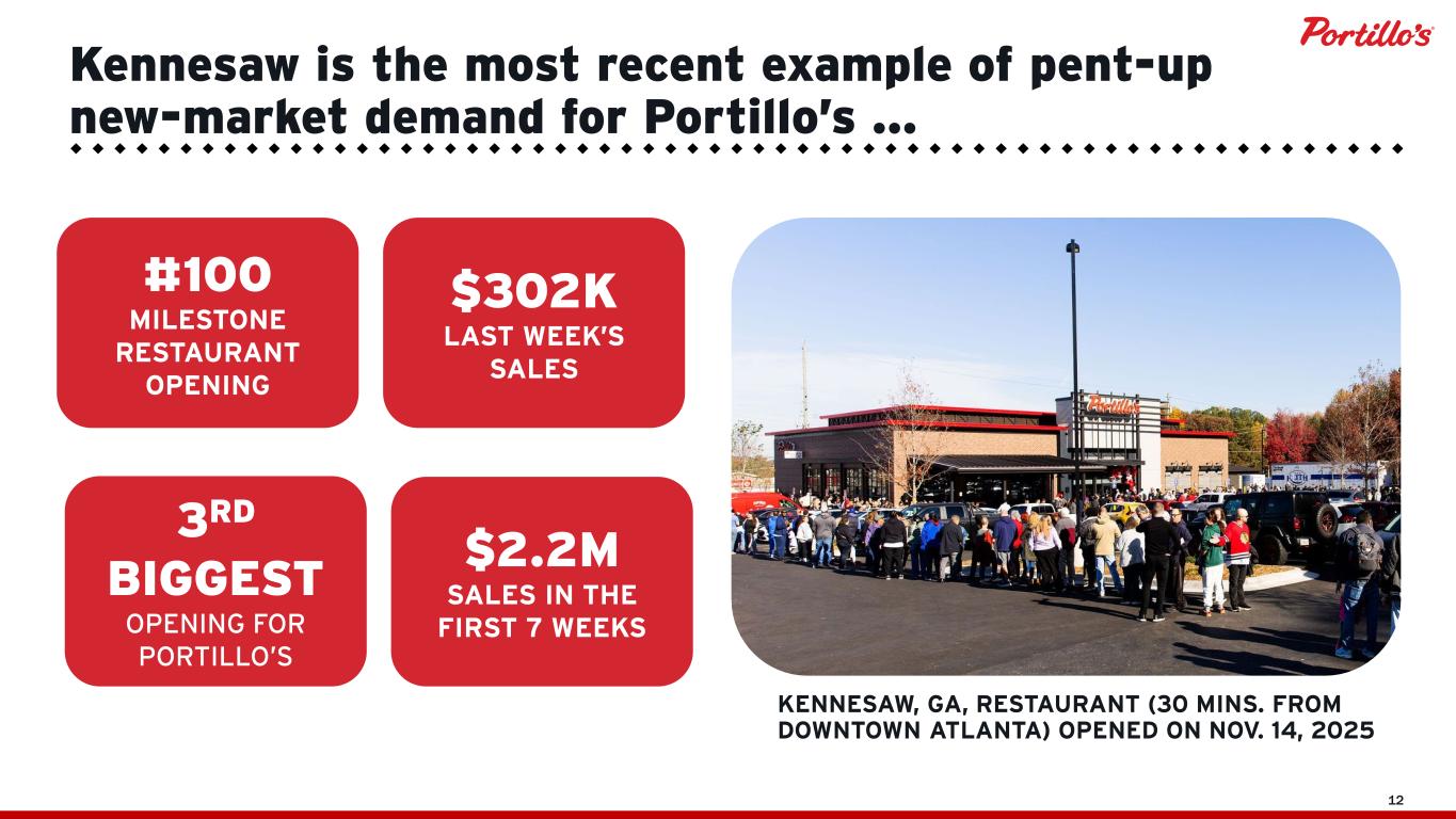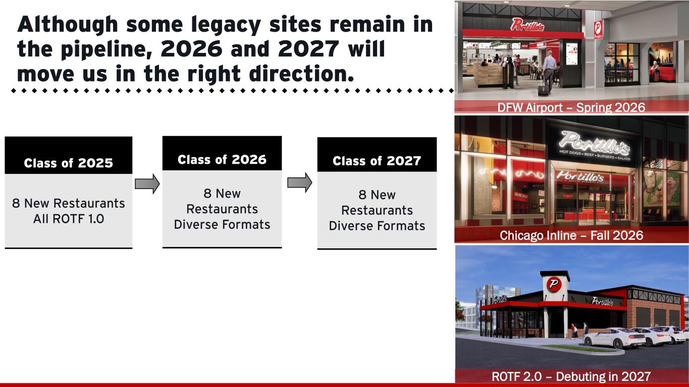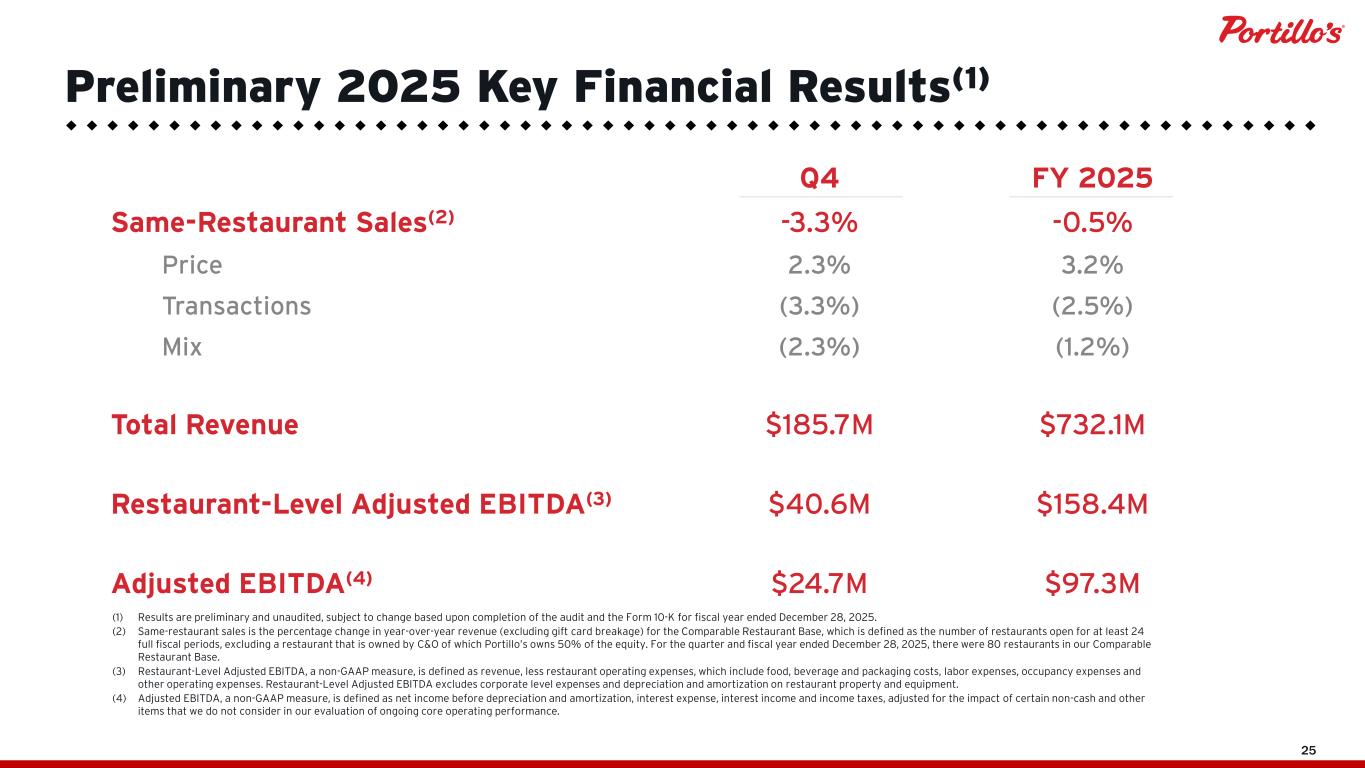 25 Q4 FY 2025 Same-Restaurant Sales(2) -3.3% -0.5% Price 2.3% 3.2% Transactions (3.3%) (2.5%) Mix (2.3%) (1.2%) Total Revenue $185.7M $732.1M Restaurant-Level Adjusted EBITDA(3) $40.6M $158.4M Adjusted EBITDA(4) $24.7M $97.3M (1) Results are preliminary and unaudited, subject to change based upon completion of the audit and the Form 10-K for fiscal year ended December 28, 2025. (2) Same-restaurant sales is the percentage change in year-over-year revenue (excluding gift card breakage) for the Comparable Restaurant Base, which is defined as the number of restaurants open for at least 24 full fiscal periods, excluding a restaurant that is owned by C&O of which Portillo’s owns 50% of the equity. For the quarter and fiscal year ended December 28, 2025, there were 80 restaurants in our Comparable Restaurant Base. (3) Restaurant-Level Adjusted EBITDA, a non-GAAP measure, is defined as revenue, less restaurant operating expenses, which include food, beverage and packaging costs, labor expenses, occupancy expenses and other operating expenses. Restaurant-Level Adjusted EBITDA excludes corporate level expenses and depreciation and amortization on restaurant property and equipment. (4) Adjusted EBITDA, a non-GAAP measure, is defined as net income before depreciation and amortization, interest expense, interest income and income taxes, adjusted for the impact of certain non-cash and other items that we do not consider in our evaluation of ongoing core operating performance. Preliminary 2025 Key Financial Results(1)