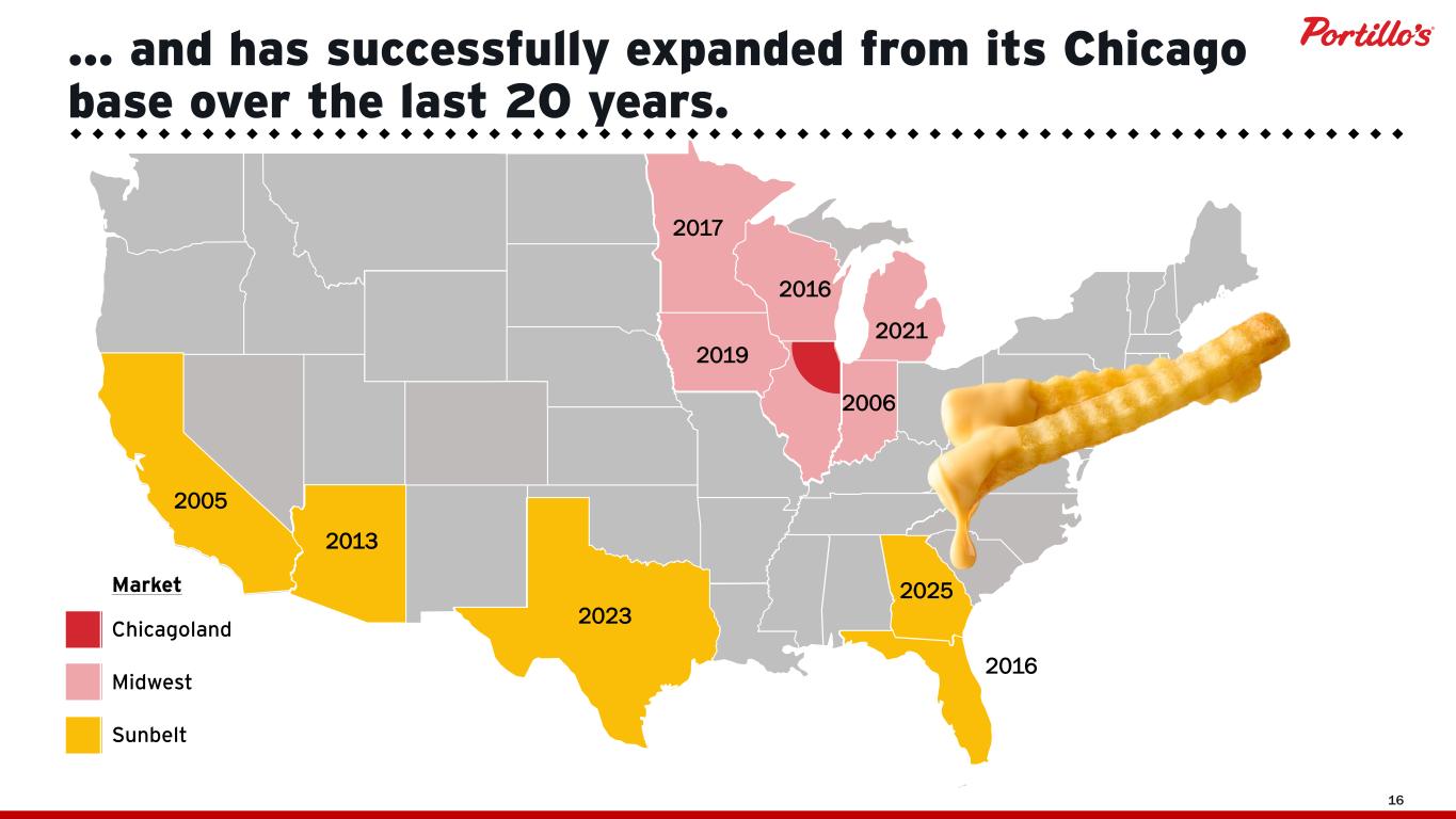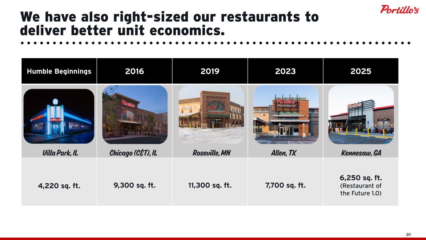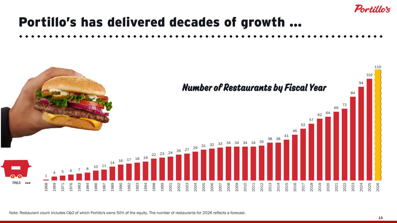 © 2019 Portillo’s Hot Dogs | All rights reserved | Do not share or duplicate confidential content, in whole or part, without written consent 15 1 4 5 6 7 8 10 11 14 16 17 18 19 22 23 24 26 27 29 31 32 33 34 34 34 34 35 38 38 41 46 52 57 62 64 69 72 84 94 102 110 19 68 19 69 19 71 19 76 19 83 19 84 19 86 19 87 19 89 19 90 19 92 19 93 19 94 19 98 19 99 20 01 20 02 20 03 20 04 20 05 20 06 20 07 20 08 20 09 20 10 20 11 20 12 20 13 20 14 20 15 20 16 20 17 20 18 20 19 20 20 20 21 20 22 20 23 20 24 20 25 20 26 1963 … Number of Restaurants by Fiscal Year Portillo’s has delivered decades of growth … Note: Restaurant count includes C&O of which Portillo's owns 50% of the equity. The number of restaurants for 2026 reflects a forecast.