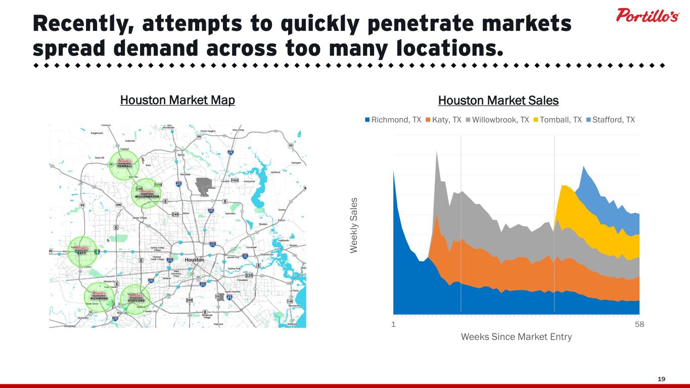 18 Our first fully developed non-Chicago market has results that compare favorably with peers. Phoenix Market Entry Number of Restaurants AUVs 2016 8 $3.9M (Company- Owned Locations) 2013 8 $5.8 (Phoenix Only) Aware 49% Trial 31% Regular Users 9% Aware 56% Trial 31% Regular Users 4% 55% 13% 63% 29% Note: Portillo’s Phoenix AUV is trailing twelve months as of Q3 2025 and includes data for the 7 comparable restaurants that were open as of September 28, 2025. SHAK company-owned locations’ AUV is as of FY 2024. Total number of restaurants is as of January 12, 2026. Source: Portillo’s CXB (data is CY2024, N=522); Public company filings; Internal data; Lit search Awareness / Trial / Usage