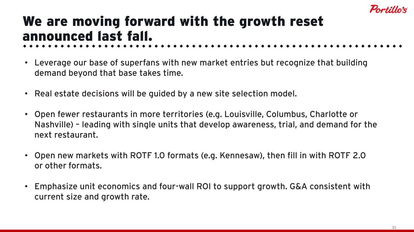 20 We have also right-sized our restaurants to deliver better unit economics. Humble Beginnings 2016 2019 2023 2025 4,220 sq. ft. 9,300 sq. ft. 11,300 sq. ft. 7,700 sq. ft. 6,250 sq. ft. (Restaurant of the Future 1.0) Villa Park, IL Allen, TX Kennesaw, GARoseville, MNChicago (C&T), IL