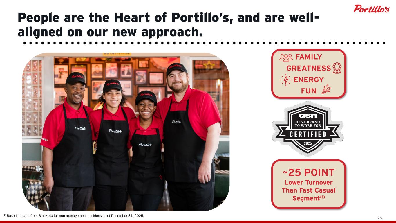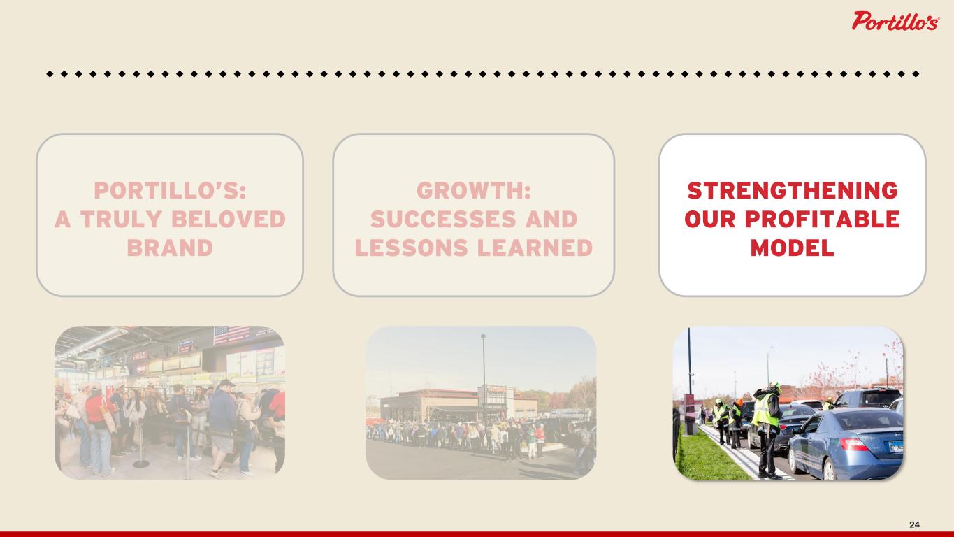 23 People are the Heart of Portillo’s, and are well- aligned on our new approach. FAMILY GREATNESS ENERGY FUN ~25 POINT Lower Turnover Than Fast Casual Segment(1) (1) Based on data from Blackbox for non-management positions as of December 31, 2025.