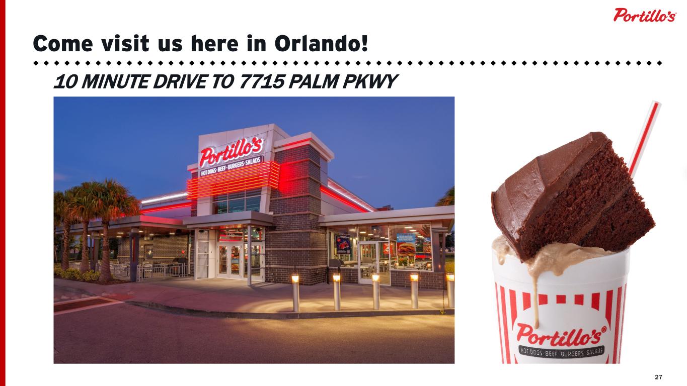 26 8 New Restaurants Commodity Inflation Mid single digit Labor Inflation 3.0% to 3.5% Restaurant-Level Adjusted EBITDA Margin(1) 20.5% to 21% General & Administrative Expenses $80M to $82M Capital Expenditures $55M to $60M Positive Free Cash Flow FY 2026 Outlook 6First Half New Restaurant Timing • First-ever airport location (Dallas Fort-Worth) • Second inline location (Chicago) (1) We are unable to reconcile the financial target for restaurant-level adjusted EBITDA margin to operating income/loss margin, the corresponding U.S. GAAP measure, due to variability and difficulty in making accurate forecasts and projections and because not all information necessary to prepare the reconciliation is available to us without unreasonable efforts. For the same reasons, we are unable to address the probable significance of the unavailable information because we cannot accurately predict all the components of the adjusted calculations, and the non-GAAP measure may be materially different than the GAAP measure. ~75% on NROs (Class of 2025 spillover, 2026, 2027) ~18% on Existing Restaurant Investments ~7% on Other Discretionary (i.e. technology) Capital Expenditure Detail Second Half 2 • ~$9M Adjusted EBITDA headwind in 2026 from full bonus assuming targets are met • $4.5M in COL at restaurant • $4.5M in G&A Adjusted EBITDA Flat vs. 2025