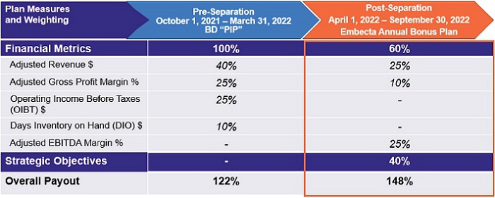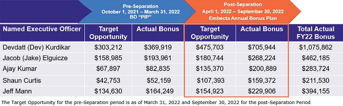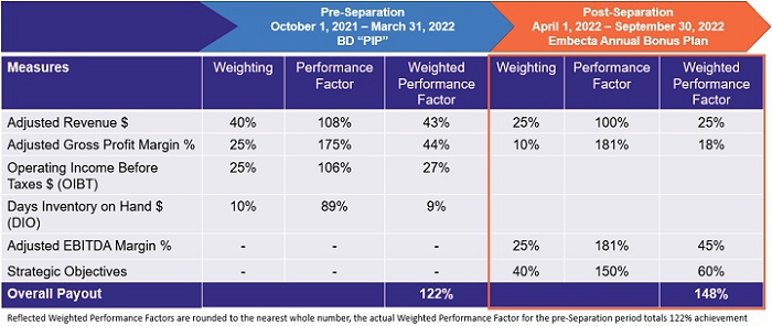 Information regarding the deferral features of the Directors’ Deferral Plan and the DCP can be found in “Compensation Discussion and Analysis—Other benefits under our executive compensation program.” Under the BD Restoration Plan and the BD Directors’ Deferral Plan, participants were eligible to defer the receipt of certain equity-based awards. Embecta associates and non-employee directors who were previously associated with BD had their balances under the BD Deferred Compensation and Retirement Benefit Restoration Plan or the BD 1996 Directors’ Deferral Plan, as applicable, transferred to the DCP or the Directors’ Deferral Plan, as applicable. The shares credited to the applicable BD plan were credited with the Embecta dividend in the form of notional Embecta shares. The notional Embecta shares are adjusted periodically to reflect the payment and reinvestment of dividends on the Embecta common stock. Amounts credited to the Embecta common stock accounts of the DCP and Directors’ Deferral Plan are paid out in cash at the time of distribution. The DCP and Directors’ Deferral Plan are not qualified, and participants have an unsecured contractual commitment of Embecta to pay the amounts due under the plan.