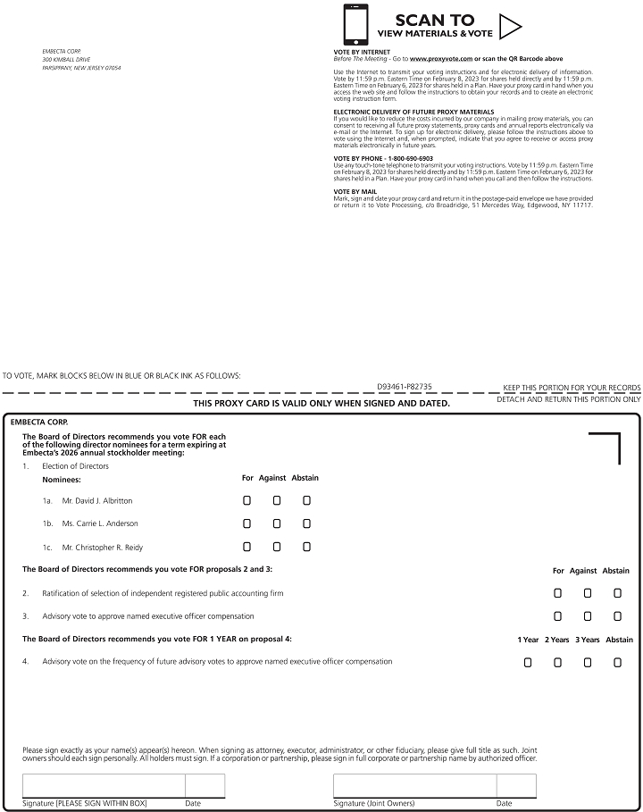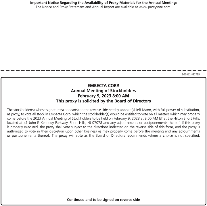 | Important Notice Regarding the Availability of Proxy Materials for the 2023 Annual Meeting of Stockholders to be held on February 9, 2023. Embecta’s proxy statement and 2022 Annual Report of Stockholders, which include Embecta’s consolidated financial statements, are available at investors.embecta.com/financials-filings/annual-reports. |