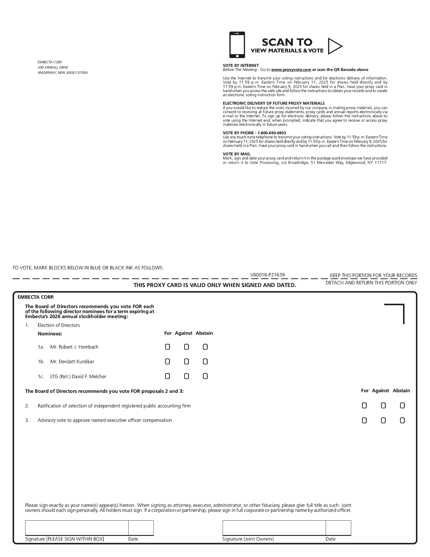 Important Notice Regarding the Availability of Proxy Materials for the 2025 Annual Meeting of Stockholders to be held on February 12, 2025. Embecta’s proxy statement and 2024 Annual Report of Stockholders, which includes Embecta’s consolidated financial statements, are available at investors.embecta.com/financials-filings/annual-reports. | ||