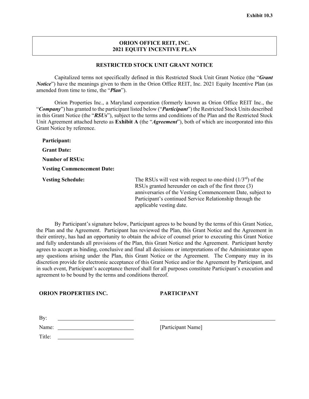 ORION OFFICE REIT, INC. 2021 EQUITY INCENTIVE PLAN RESTRICTED STOCK UNIT GRANT NOTICE Capitalized terms not specifically defined in this Restricted Stock Unit Grant Notice (the “Grant Notice”) have the meanings given to them in the Orion Office REIT, Inc. 2021 Equity Incentive Plan (as amended from time to time, the “Plan”). Orion Properties Inc., a Maryland corporation (formerly known as Orion Office REIT Inc., the “Company”) has granted to the participant listed below (“Participant”) the Restricted Stock Units described in this Grant Notice (the “RSUs”), subject to the terms and conditions of the Plan and the Restricted Stock Unit Agreement attached hereto as Exhibit A (the “Agreement”), both of which are incorporated into this Grant Notice by reference. Participant: Grant Date: Number of RSUs: Vesting Commencement Date: Vesting Schedule: The RSUs will vest with respect to one-third (1/3rd) of the RSUs granted hereunder on each of the first three (3) anniversaries of the Vesting Commencement Date, subject to Participant’s continued Service Relationship through the applicable vesting date. By Participant’s signature below, Participant agrees to be bound by the terms of this Grant Notice, the Plan and the Agreement. Participant has reviewed the Plan, this Grant Notice and the Agreement in their entirety, has had an opportunity to obtain the advice of counsel prior to executing this Grant Notice and fully understands all provisions of the Plan, this Grant Notice and the Agreement. Participant hereby agrees to accept as binding, conclusive and final all decisions or interpretations of the Administrator upon any questions arising under the Plan, this Grant Notice or the Agreement. The Company may in its discretion provide for electronic acceptance of this Grant Notice and/or the Agreement by Participant, and in such event, Participant’s acceptance thereof shall for all purposes constitute Participant’s execution and agreement to be bound by the terms and conditions thereof. ORION PROPERTIES INC. PARTICIPANT By: Name: [Participant Name] Title: Exhibit 10.3