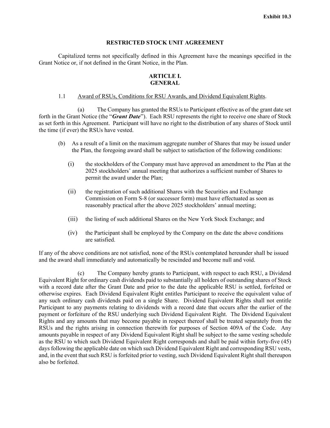 RESTRICTED STOCK UNIT AGREEMENT Capitalized terms not specifically defined in this Agreement have the meanings specified in the Grant Notice or, if not defined in the Grant Notice, in the Plan. ARTICLE I. GENERAL 1.1 Award of RSUs, Conditions for RSU Awards, and Dividend Equivalent Rights. (a) The Company has granted the RSUs to Participant effective as of the grant date set forth in the Grant Notice (the “Grant Date”). Each RSU represents the right to receive one share of Stock as set forth in this Agreement. Participant will have no right to the distribution of any shares of Stock until the time (if ever) the RSUs have vested. (b) As a result of a limit on the maximum aggregate number of Shares that may be issued under the Plan, the foregoing award shall be subject to satisfaction of the following conditions: (i) the stockholders of the Company must have approved an amendment to the Plan at the 2025 stockholders’ annual meeting that authorizes a sufficient number of Shares to permit the award under the Plan; (ii) the registration of such additional Shares with the Securities and Exchange Commission on Form S-8 (or successor form) must have effectuated as soon as reasonably practical after the above 2025 stockholders’ annual meeting; (iii) the listing of such additional Shares on the New York Stock Exchange; and (iv) the Participant shall be employed by the Company on the date the above conditions are satisfied. If any of the above conditions are not satisfied, none of the RSUs contemplated hereunder shall be issued and the award shall immediately and automatically be rescinded and become null and void. (c) The Company hereby grants to Participant, with respect to each RSU, a Dividend Equivalent Right for ordinary cash dividends paid to substantially all holders of outstanding shares of Stock with a record date after the Grant Date and prior to the date the applicable RSU is settled, forfeited or otherwise expires. Each Dividend Equivalent Right entitles Participant to receive the equivalent value of any such ordinary cash dividends paid on a single Share. Dividend Equivalent Rights shall not entitle Participant to any payments relating to dividends with a record date that occurs after the earlier of the payment or forfeiture of the RSU underlying such Dividend Equivalent Right. The Dividend Equivalent Rights and any amounts that may become payable in respect thereof shall be treated separately from the RSUs and the rights arising in connection therewith for purposes of Section 409A of the Code. Any amounts payable in respect of any Dividend Equivalent Right shall be subject to the same vesting schedule as the RSU to which such Dividend Equivalent Right corresponds and shall be paid within forty-five (45) days following the applicable date on which such Dividend Equivalent Right and corresponding RSU vests, and, in the event that such RSU is forfeited prior to vesting, such Dividend Equivalent Right shall thereupon also be forfeited. Exhibit 10.3