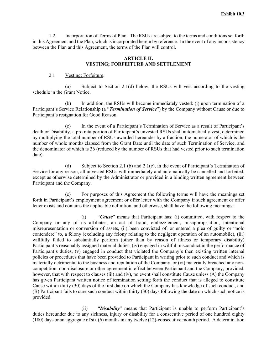 1.2 Incorporation of Terms of Plan. The RSUs are subject to the terms and conditions set forth in this Agreement and the Plan, which is incorporated herein by reference. In the event of any inconsistency between the Plan and this Agreement, the terms of the Plan will control. ARTICLE II. VESTING; FORFEITURE AND SETTLEMENT 2.1 Vesting; Forfeiture. (a) Subject to Section 2.1(d) below, the RSUs will vest according to the vesting schedule in the Grant Notice. (b) In addition, the RSUs will become immediately vested: (i) upon termination of a Participant’s Service Relationship (a “Termination of Service”) by the Company without Cause or due to Participant’s resignation for Good Reason. (c) In the event of a Participant’s Termination of Service as a result of Participant’s death or Disability, a pro rata portion of Participant’s unvested RSUs shall automatically vest, determined by multiplying the total number of RSUs awarded hereunder by a fraction, the numerator of which is the number of whole months elapsed from the Grant Date until the date of such Termination of Service, and the denominator of which is 36 (reduced by the number of RSUs that had vested prior to such termination date). (d) Subject to Section 2.1 (b) and 2.1(c), in the event of Participant’s Termination of Service for any reason, all unvested RSUs will immediately and automatically be cancelled and forfeited, except as otherwise determined by the Administrator or provided in a binding written agreement between Participant and the Company. (e) For purposes of this Agreement the following terms will have the meanings set forth in Participant’s employment agreement or offer letter with the Company if such agreement or offer letter exists and contains the applicable definition, and otherwise, shall have the following meanings: (i) “Cause” means that Participant has: (i) committed, with respect to the Company or any of its affiliates, an act of fraud, embezzlement, misappropriation, intentional misrepresentation or conversion of assets, (ii) been convicted of, or entered a plea of guilty or “nolo contendere” to, a felony (excluding any felony relating to the negligent operation of an automobile), (iii) willfully failed to substantially perform (other than by reason of illness or temporary disability) Participant’s reasonably assigned material duties, (iv) engaged in willful misconduct in the performance of Participant’s duties, (v) engaged in conduct that violated the Company’s then existing written internal policies or procedures that have been provided to Participant in writing prior to such conduct and which is materially detrimental to the business and reputation of the Company, or (vi) materially breached any non- competition, non-disclosure or other agreement in effect between Participant and the Company; provided, however, that with respect to clauses (iii) and (iv), no event shall constitute Cause unless (A) the Company has given Participant written notice of termination setting forth the conduct that is alleged to constitute Cause within thirty (30) days of the first date on which the Company has knowledge of such conduct, and (B) Participant fails to cure such conduct within thirty (30) days following the date on which such notice is provided. (ii) “Disability” means that Participant is unable to perform Participant’s duties hereunder due to any sickness, injury or disability for a consecutive period of one hundred eighty (180) days or an aggregate of six (6) months in any twelve (12)-consecutive month period. A determination Exhibit 10.3