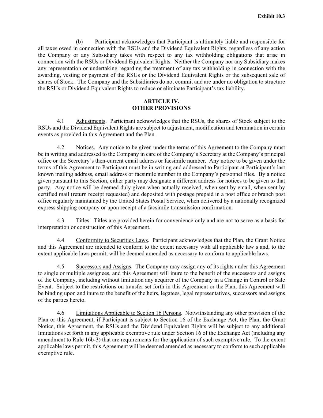 (b) Participant acknowledges that Participant is ultimately liable and responsible for all taxes owed in connection with the RSUs and the Dividend Equivalent Rights, regardless of any action the Company or any Subsidiary takes with respect to any tax withholding obligations that arise in connection with the RSUs or Dividend Equivalent Rights. Neither the Company nor any Subsidiary makes any representation or undertaking regarding the treatment of any tax withholding in connection with the awarding, vesting or payment of the RSUs or the Dividend Equivalent Rights or the subsequent sale of shares of Stock. The Company and the Subsidiaries do not commit and are under no obligation to structure the RSUs or Dividend Equivalent Rights to reduce or eliminate Participant’s tax liability. ARTICLE IV. OTHER PROVISIONS 4.1 Adjustments. Participant acknowledges that the RSUs, the shares of Stock subject to the RSUs and the Dividend Equivalent Rights are subject to adjustment, modification and termination in certain events as provided in this Agreement and the Plan. 4.2 Notices. Any notice to be given under the terms of this Agreement to the Company must be in writing and addressed to the Company in care of the Company’s Secretary at the Company’s principal office or the Secretary’s then-current email address or facsimile number. Any notice to be given under the terms of this Agreement to Participant must be in writing and addressed to Participant at Participant’s last known mailing address, email address or facsimile number in the Company’s personnel files. By a notice given pursuant to this Section, either party may designate a different address for notices to be given to that party. Any notice will be deemed duly given when actually received, when sent by email, when sent by certified mail (return receipt requested) and deposited with postage prepaid in a post office or branch post office regularly maintained by the United States Postal Service, when delivered by a nationally recognized express shipping company or upon receipt of a facsimile transmission confirmation. 4.3 Titles. Titles are provided herein for convenience only and are not to serve as a basis for interpretation or construction of this Agreement. 4.4 Conformity to Securities Laws. Participant acknowledges that the Plan, the Grant Notice and this Agreement are intended to conform to the extent necessary with all applicable law s and, to the extent applicable laws permit, will be deemed amended as necessary to conform to applicable laws. 4.5 Successors and Assigns. The Company may assign any of its rights under this Agreement to single or multiple assignees, and this Agreement will inure to the benefit of the successors and assigns of the Company, including without limitation any acquirer of the Company in a Change in Control or Sale Event. Subject to the restrictions on transfer set forth in this Agreement or the Plan, this Agreement will be binding upon and inure to the benefit of the heirs, legatees, legal representatives, successors and assigns of the parties hereto. 4.6 Limitations Applicable to Section 16 Persons. Notwithstanding any other provision of the Plan or this Agreement, if Participant is subject to Section 16 of the Exchange Act, the Plan, the Grant Notice, this Agreement, the RSUs and the Dividend Equivalent Rights will be subject to any additional limitations set forth in any applicable exemptive rule under Section 16 of the Exchange Act (including any amendment to Rule 16b-3) that are requirements for the application of such exemptive rule. To the extent applicable laws permit, this Agreement will be deemed amended as necessary to conform to such applicable exemptive rule. Exhibit 10.3