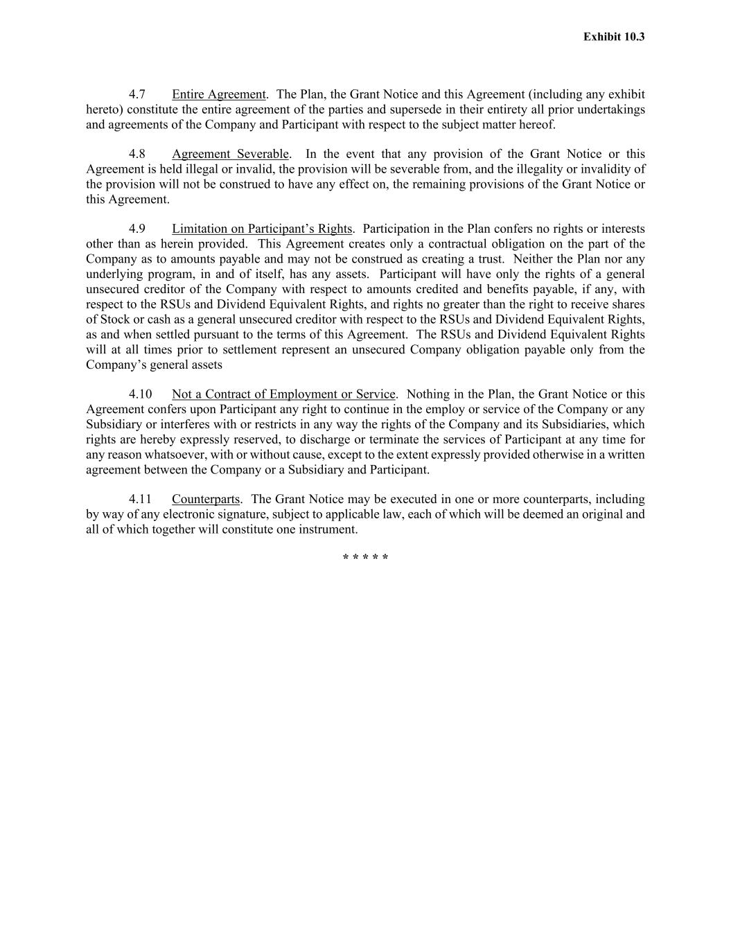 4.7 Entire Agreement. The Plan, the Grant Notice and this Agreement (including any exhibit hereto) constitute the entire agreement of the parties and supersede in their entirety all prior undertakings and agreements of the Company and Participant with respect to the subject matter hereof. 4.8 Agreement Severable. In the event that any provision of the Grant Notice or this Agreement is held illegal or invalid, the provision will be severable from, and the illegality or invalidity of the provision will not be construed to have any effect on, the remaining provisions of the Grant Notice or this Agreement. 4.9 Limitation on Participant’s Rights. Participation in the Plan confers no rights or interests other than as herein provided. This Agreement creates only a contractual obligation on the part of the Company as to amounts payable and may not be construed as creating a trust. Neither the Plan nor any underlying program, in and of itself, has any assets. Participant will have only the rights of a general unsecured creditor of the Company with respect to amounts credited and benefits payable, if any, with respect to the RSUs and Dividend Equivalent Rights, and rights no greater than the right to receive shares of Stock or cash as a general unsecured creditor with respect to the RSUs and Dividend Equivalent Rights, as and when settled pursuant to the terms of this Agreement. The RSUs and Dividend Equivalent Rights will at all times prior to settlement represent an unsecured Company obligation payable only from the Company’s general assets 4.10 Not a Contract of Employment or Service. Nothing in the Plan, the Grant Notice or this Agreement confers upon Participant any right to continue in the employ or service of the Company or any Subsidiary or interferes with or restricts in any way the rights of the Company and its Subsidiaries, which rights are hereby expressly reserved, to discharge or terminate the services of Participant at any time for any reason whatsoever, with or without cause, except to the extent expressly provided otherwise in a written agreement between the Company or a Subsidiary and Participant. 4.11 Counterparts. The Grant Notice may be executed in one or more counterparts, including by way of any electronic signature, subject to applicable law, each of which will be deemed an original and all of which together will constitute one instrument. * * * * * Exhibit 10.3