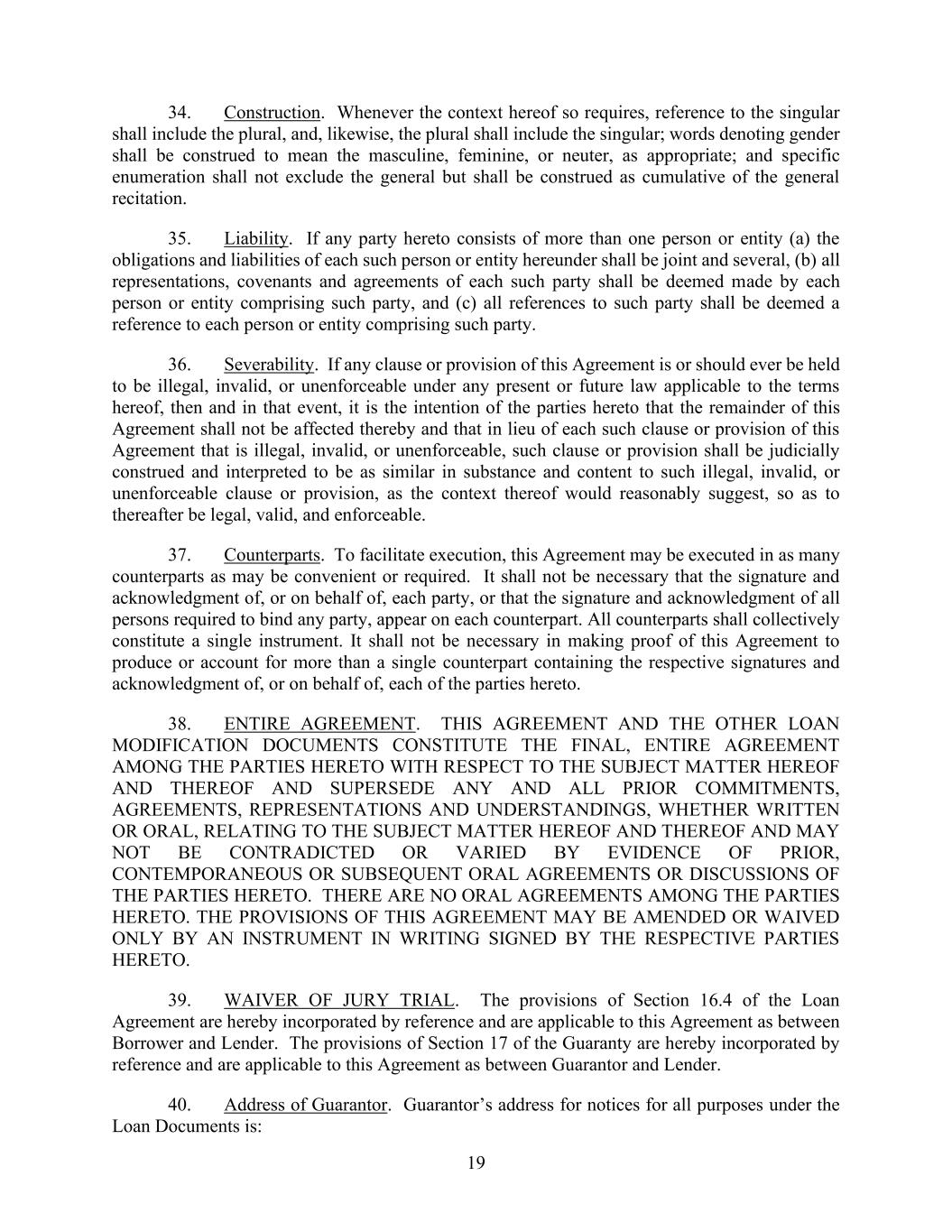 19 34. Construction. Whenever the context hereof so requires, reference to the singular shall include the plural, and, likewise, the plural shall include the singular; words denoting gender shall be construed to mean the masculine, feminine, or neuter, as appropriate; and specific enumeration shall not exclude the general but shall be construed as cumulative of the general recitation. 35. Liability. If any party hereto consists of more than one person or entity (a) the obligations and liabilities of each such person or entity hereunder shall be joint and several, (b) all representations, covenants and agreements of each such party shall be deemed made by each person or entity comprising such party, and (c) all references to such party shall be deemed a reference to each person or entity comprising such party. 36. Severability. If any clause or provision of this Agreement is or should ever be held to be illegal, invalid, or unenforceable under any present or future law applicable to the terms hereof, then and in that event, it is the intention of the parties hereto that the remainder of this Agreement shall not be affected thereby and that in lieu of each such clause or provision of this Agreement that is illegal, invalid, or unenforceable, such clause or provision shall be judicially construed and interpreted to be as similar in substance and content to such illegal, invalid, or unenforceable clause or provision, as the context thereof would reasonably suggest, so as to thereafter be legal, valid, and enforceable. 37. Counterparts. To facilitate execution, this Agreement may be executed in as many counterparts as may be convenient or required. It shall not be necessary that the signature and acknowledgment of, or on behalf of, each party, or that the signature and acknowledgment of all persons required to bind any party, appear on each counterpart. All counterparts shall collectively constitute a single instrument. It shall not be necessary in making proof of this Agreement to produce or account for more than a single counterpart containing the respective signatures and acknowledgment of, or on behalf of, each of the parties hereto. 38. ENTIRE AGREEMENT. THIS AGREEMENT AND THE OTHER LOAN MODIFICATION DOCUMENTS CONSTITUTE THE FINAL, ENTIRE AGREEMENT AMONG THE PARTIES HERETO WITH RESPECT TO THE SUBJECT MATTER HEREOF AND THEREOF AND SUPERSEDE ANY AND ALL PRIOR COMMITMENTS, AGREEMENTS, REPRESENTATIONS AND UNDERSTANDINGS, WHETHER WRITTEN OR ORAL, RELATING TO THE SUBJECT MATTER HEREOF AND THEREOF AND MAY NOT BE CONTRADICTED OR VARIED BY EVIDENCE OF PRIOR, CONTEMPORANEOUS OR SUBSEQUENT ORAL AGREEMENTS OR DISCUSSIONS OF THE PARTIES HERETO. THERE ARE NO ORAL AGREEMENTS AMONG THE PARTIES HERETO. THE PROVISIONS OF THIS AGREEMENT MAY BE AMENDED OR WAIVED ONLY BY AN INSTRUMENT IN WRITING SIGNED BY THE RESPECTIVE PARTIES HERETO. 39. WAIVER OF JURY TRIAL. The provisions of Section 16.4 of the Loan Agreement are hereby incorporated by reference and are applicable to this Agreement as between Borrower and Lender. The provisions of Section 17 of the Guaranty are hereby incorporated by reference and are applicable to this Agreement as between Guarantor and Lender. 40. Address of Guarantor. Guarantor’s address for notices for all purposes under the Loan Documents is: