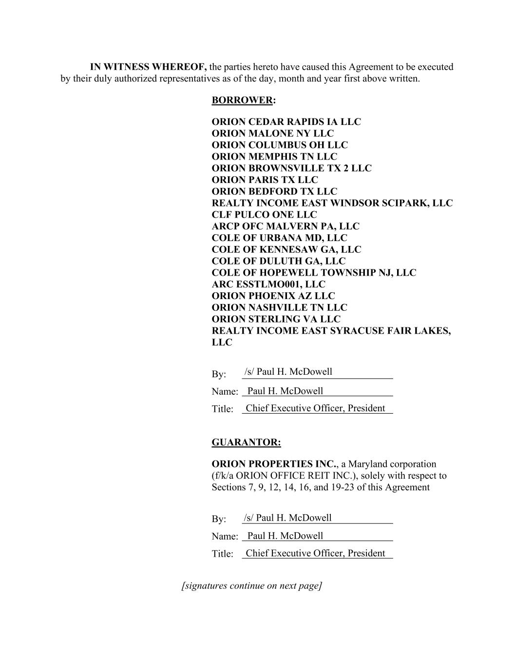 /s/ Paul H. McDowell Paul H. McDowell Chief Executive Officer, President /s/ Paul H. McDowell Paul H. McDowell Chief Executive Officer, President IN WITNESS WHEREOF, the parties hereto have caused this Agreement to be executed by their duly authorized representatives as of the day, month and year first above written. BORROWER: ORION CEDAR RAPIDS IA LLC ORION MALONE NY LLC ORION COLUMBUS OH LLC ORION MEMPHIS TN LLC ORION BROWNSVILLE TX 2 LLC ORION PARIS TX LLC ORION BEDFORD TX LLC REALTY INCOME EAST WINDSOR SCIPARK, LLC CLF PULCO ONE LLC ARCP OFC MALVERN PA, LLC COLE OF URBANA MD, LLC COLE OF KENNESAW GA, LLC COLE OF DULUTH GA, LLC COLE OF HOPEWELL TOWNSHIP NJ, LLC ARC ESSTLMO001, LLC ORION PHOENIX AZ LLC ORION NASHVILLE TN LLC ORION STERLING VA LLC REALTY INCOME EAST SYRACUSE FAIR LAKES, LLC By: Name: Title: GUARANTOR: ORION PROPERTIES INC., a Maryland corporation (f/k/a ORION OFFICE REIT INC.), solely with respect to Sections 7, 9, 12, 14, 16, and 19-23 of this Agreement By: Name: Title: [signatures continue on next page]