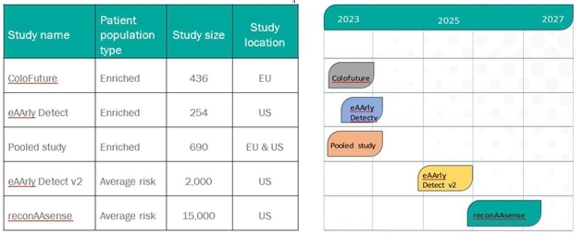 In October 2023, we announced the results of the ColoFuture study, which demonstrated a sensitivity of 94% for colorectal cancer (CRC) and 97% specificity, along with an 80% sensitivity for Aas and 95% specificity. In December 2023, we released topline results from our eAArly DETECT clinical study in the U.S., which reported a sensitivity of 97% for CRC, 97% specificity, and an 82% sensitivity for advanced adenomas and 97% specificity. These topline results reaffirm the positive findings from ColoFuture, our European counterpart, which were reported in October 2023.