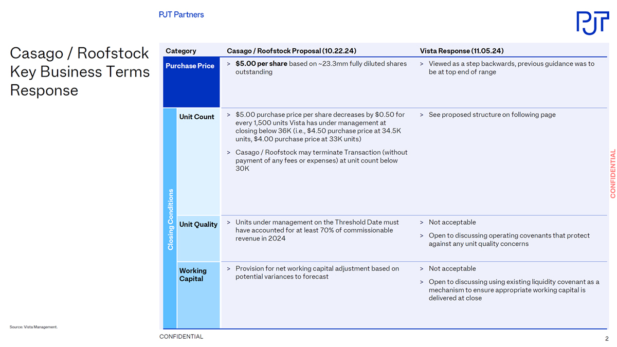 CONFIDENTIAL Casago / Roofstock Key Business Terms Response Source: Vista Management. Category Casago / Roofstock Proposal (10.22.24) Vista Response (11.05.24) Purchase Price $5.00 per share based on ~23.3mm fully diluted shares outstanding Viewed as a step backwards, previous guidance was to be at top end of range Closing Conditions Unit Count $5.00 purchase price per share decreases by $0.50 for every 1,500 units Vista has under management at closing below 36K (i.e., $4.50 purchase price at 34.5K units, $4.00 purchase price at 33K units) Casago / Roofstock may terminate Transaction (without payment of any fees or expenses) at unit count below 30K See proposed structure on following page Unit Quality Units under management on the Threshold Date must have accounted for at least 70% of commissionable revenue in 2024 Not acceptable Open to discussing operating covenants that protect against any unit quality concerns Working Capital Provision for net working capital adjustment based on potential variances to forecast Not acceptable Open to discussing using existing liquidity covenant as a mechanism to ensure appropriate working capital is delivered at close