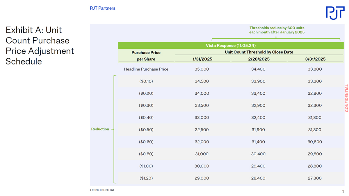 CONFIDENTIAL Exhibit A: Unit Count Purchase Price Adjustment Schedule Thresholds reduce by 600 units each month after January 2025 ReductionVista Response (11.05.24)Purchase PriceUnit Count Threshold by Close Dateper Share1/31/20252/28/20253/31/2025Headline Purchase Price 35,000 34,400 33,800 ($0.10) 34,500 33,900 33,300 ($0.20) 34,000 33,400 32,800 ($0.30) 33,500 32,900 32,300 ($0.40) 33,000 32,400 31,800 ($0.50) 32,500 31,900 31,300 ($0.60) 32,000 31,400 30,800 ($0.80) 31,000 30,400 29,800 ($1.00) 30,000 29,400 28,800 ($1.20) 29,000 28,400 27,800 3