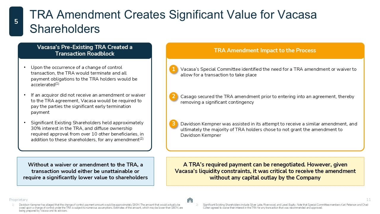 Appendix  Key Transaction Filings  Filing Date  Press Release of Revised Acquisition Proposal From Casago  March 17, 2025  Letter to Shareholders From the Vacasa Board of Directors  March 28, 2025  Definitive Proxy Statement  March 28, 2025  Background of the Mergers  Key Sections of the Background of the Mergers  Page   Initiation of Strategic Review Process in Light of Increased Downward Pressure  20  Preliminary Proposal From Davidson Kempner Regarding Potential Financing Transaction  21  Context on the TRA Amendment  25  Start of Negotiations Between Casago and Davidson Kempner  41  Davidson Kempner Board Appointees’ Resignation from Vacasa’s Board  45  Initial Davidson Kempner Proposal Conditioned on TRA Amendment  45  Start of Engagement with Davidson Kempner Regarding Non-Binding Proposal  49  Majority of TRA Beneficiaries Not Supportive of Approving a TRA Amendment for Davidson Kempner  57