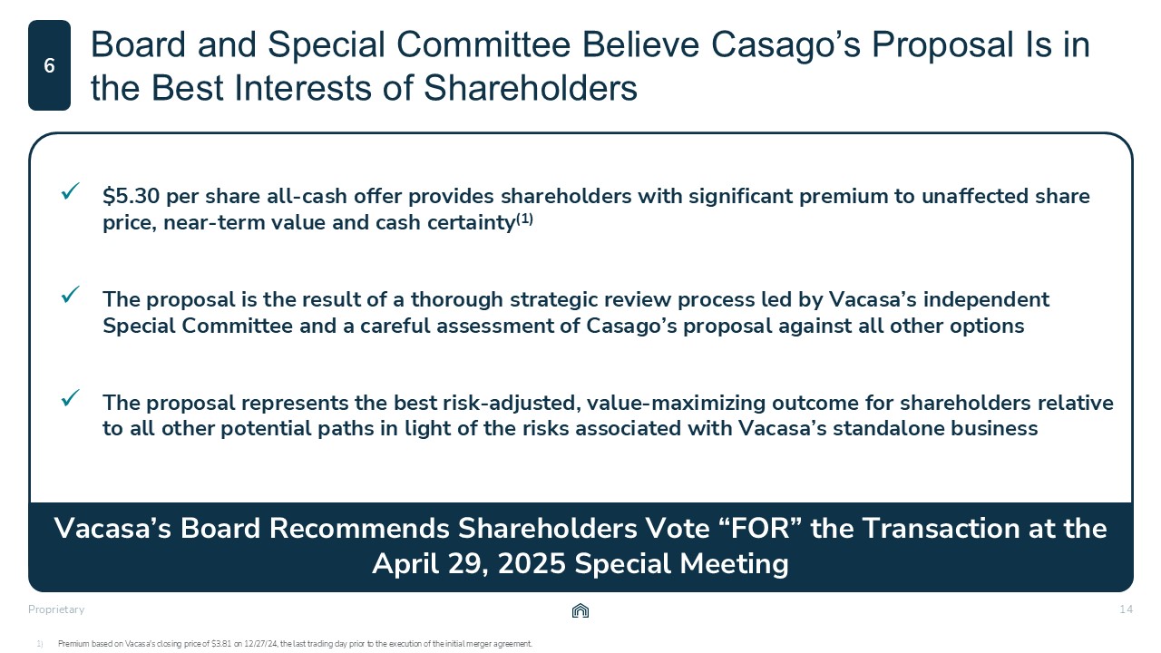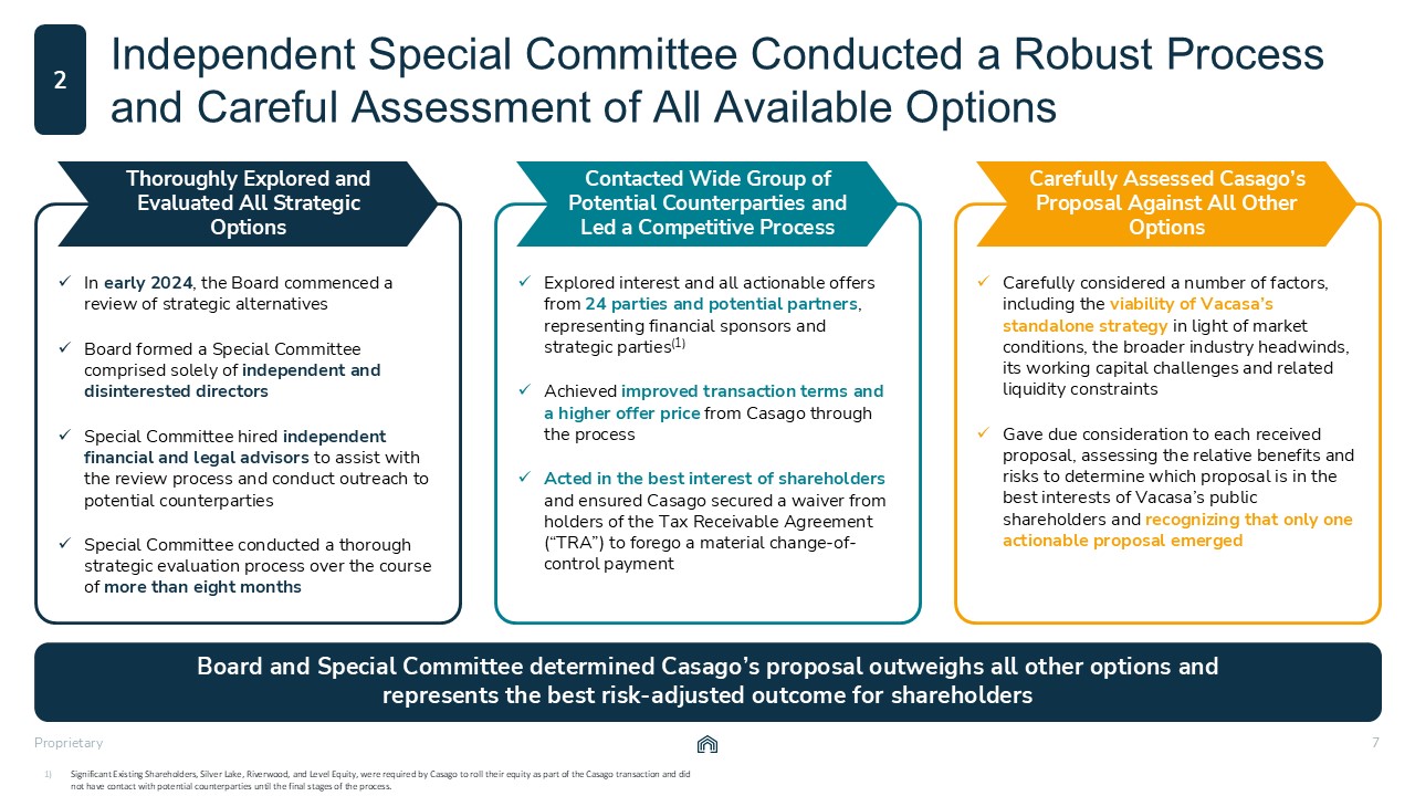Premium based on Vacasa’s closing price of $3.81 on 12/27/24, the last trading day prior to the execution of the initial merger agreement.  Executive Summary  All-cash offer of $5.30 represents significant premium to unaffected share price and provides Vacasa shareholders near-term value and certainty(1)  1  Independent Special Committee conducted a robust strategic review process to ensure the transaction with Casago delivers the highest available value to shareholders  2  The transaction de-risks public shareholders’ investment in Vacasa  3  Casago’s proposal is the only actionable transaction available, providing greater certainty relative to Davidson Kempner’s proposal  5  Special Committee and Board believe Casago’s proposal is fair to and in the best interests of shareholders, and recommend shareholders vote in favor of transaction  6  Transaction delay increases risks associated with the standalone plan, including the potential need for the business to raise incremental capital, which may not be available  4