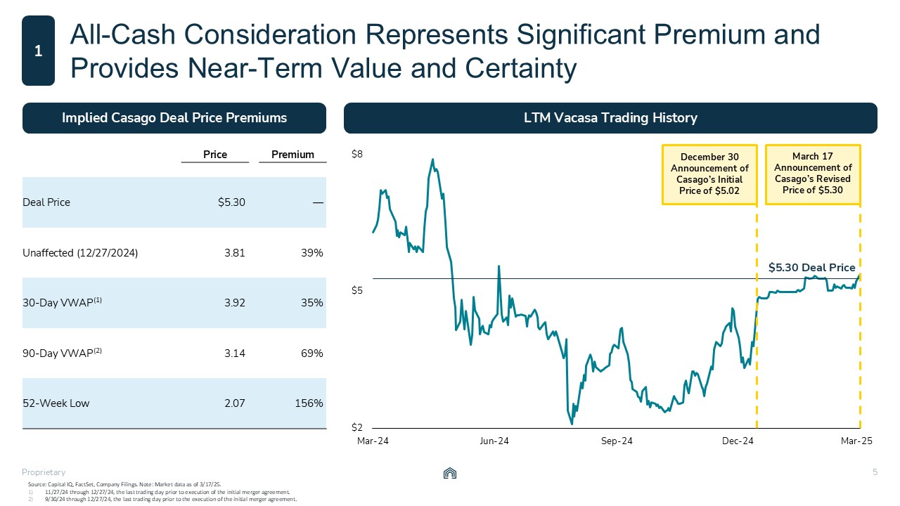 Source: Capital IQ, FactSet, Company Filings. Note: Market data as of 3/17/25.  11/27/24 through 12/27/24, the last trading day prior to execution of the initial merger agreement.  9/30/24 through 12/27/24, the last trading day prior to the execution of the initial merger agreement.  Price  Premium  Deal Price  $5.30  —  Unaffected (12/27/2024)  3.81     39%  30-Day VWAP(1)   3.92  35%  90-Day VWAP(2)   3.14  69%  52-Week Low  2.07  156%  Implied Casago Deal Price Premiums  LTM Vacasa Trading History  All-Cash Consideration Represents Significant Premium and Provides Near-Term Value and Certainty  1  December 30Announcement of Casago’s Initial Price of $5.02  $5.30 Deal Price  March 17 Announcement of Casago’s Revised Price of $5.30