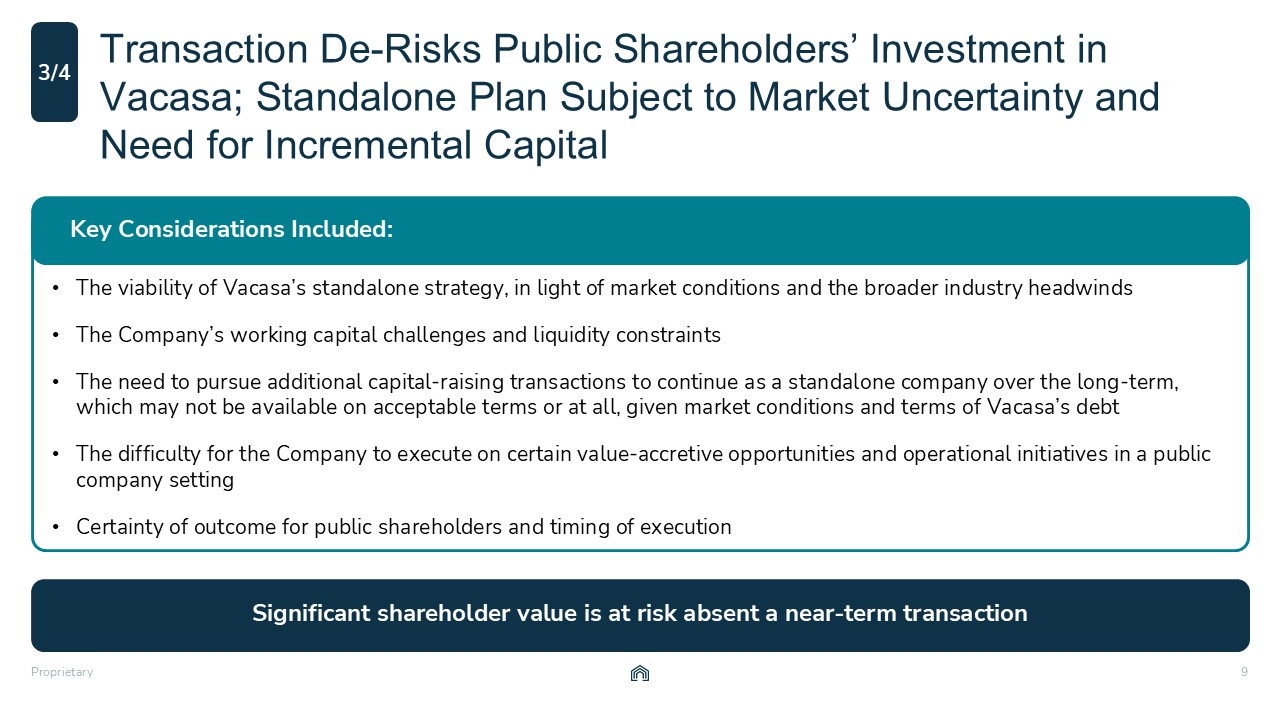The viability of Vacasa’s standalone strategy, in light of market conditions and the broader industry headwinds  The Company’s working capital challenges and liquidity constraints  The need to pursue additional capital-raising transactions to continue as a standalone company over the long-term, which may not be available on acceptable terms or at all, given market conditions and terms of Vacasa’s debt  The difficulty for the Company to execute on certain value-accretive opportunities and operational initiatives in a public company setting  Certainty of outcome for public shareholders and timing of execution  Key Considerations Included:  Transaction De-Risks Public Shareholders’ Investment in Vacasa; Standalone Plan Subject to Market Uncertainty and Need for Incremental Capital  Significant shareholder value is at risk absent a near-term transaction   3/4