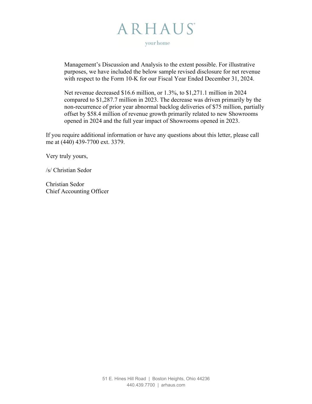 51 E. Hines Hill Road | Boston Heights, Ohio 44236 440.439.7700 | arhaus.com Management’s Discussion and Analysis to the extent possible. For illustrative purposes, we have included the below sample revised disclosure for net revenue with respect to the Form 10-K for our Fiscal Year Ended December 31, 2024. Net revenue decreased $16.6 million, or 1.3%, to $1,271.1 million in 2024 compared to $1,287.7 million in 2023. The decrease was driven primarily by the non-recurrence of prior year abnormal backlog deliveries of $75 million, partially offset by $58.4 million of revenue growth primarily related to new Showrooms opened in 2024 and the full year impact of Showrooms opened in 2023. If you require additional information or have any questions about this letter, please call me at (440) 439-7700 ext. 3379. Very truly yours, /s/ Christian Sedor Christian Sedor Chief Accounting Officer
